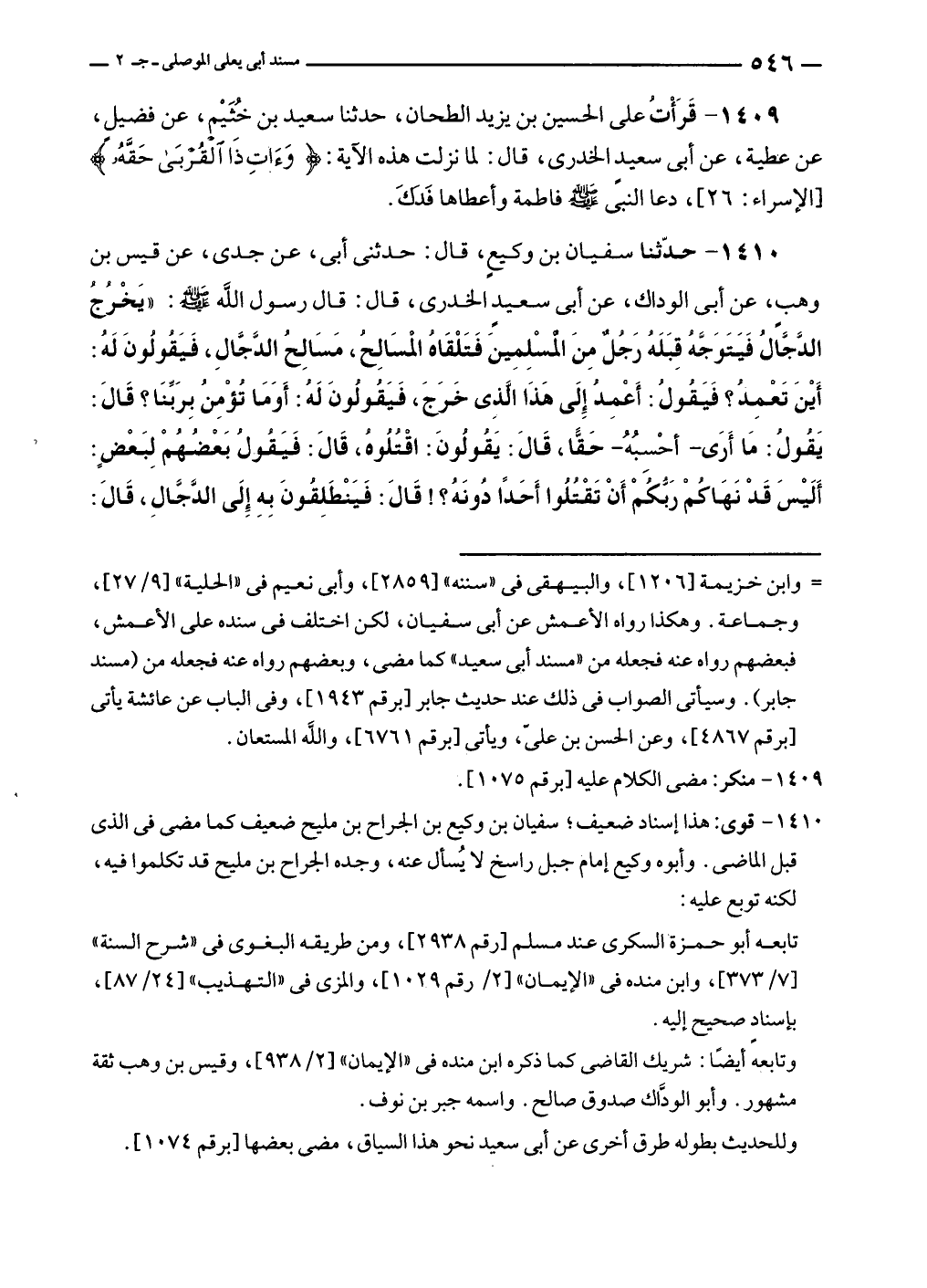 ١٤٠٩ - قَرَأْتُ على الحسين بن يزيد الطحان، حدثنا سعيد بن خُثَيْيم، عن فضيل، عن عطية، عن أبى سعيدٍ الخدرى، قال: لما نزلت هذه الآية: {وَآتِ ذَا الْقُرْبَى حَقَّهُ} [الإسراء: ٢٦]، دعا النبي - صلى الله عليه وسلم - فاطمة وأعطاها فَدَكَ.