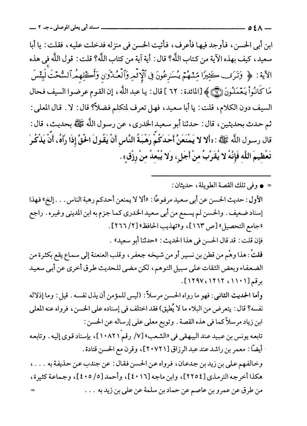 ابن أبى الحسن، فأوجد فيها فأعرف، فأتيت الحسن في منزله فدخلت عليه، فقلت: يا أبا سعيد، كيف بهذه الآية من كتاب الله؟ قال: أية آية من كتاب الله؟ قلت: قول الله في هذه الآية: {وَتَرَى كَثِيرًا مِنْهُمْ يُسَارِعُونَ فِي الْإِثْمِ وَالْعُدْوَانِ وَأَكْلِهِمُ السُّحْتَ لَبِئْسَ مَا كَانُوا يَعْمَلُونَ (٦٢)} [المائدة: ٦٢] قال: يا عبد الله، إن القوم عرضوا السيف فحال السيف دون الكلام، قلت: يا أبا سعيد، فهل تعرف لمتكلم فضلًا؟ قال: لا. قال المعلى: ثم حدث بحديثين، قال: حدثنا أبو سعيد الخدرى، عن رسول الله - صلى الله عليه وسلم - بحديثٍ، قال: قال رسول الله - صلى الله عليه وسلم -: "أَلا لا يَمْنَعَنَّ أَحَدَكم رَهْبَةُ النَّاسِ أَنْ يَقُولَ الحقَّ إِذَا رَآهُ، أَنْ يَذْكُرَ تَعْظِيمَ اللهِ فَإِنَّهُ لا يُقَرِّبُ مِنْ أَجَل، وَلا يُبْعِدُ مِنْ رِزْقٍ".