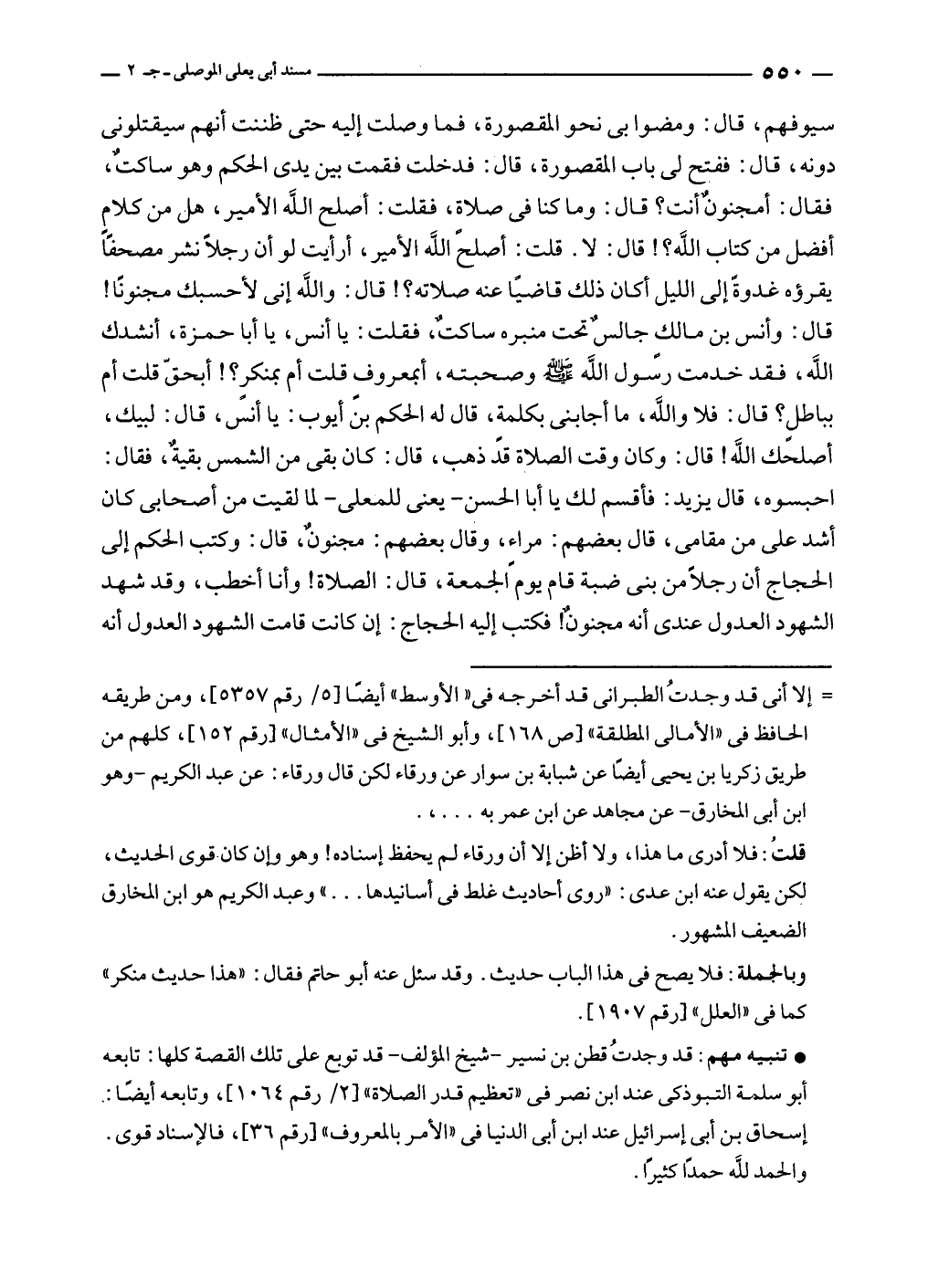 سيوفهم، قال: ومضوا بى نحو المقصورة، فما وصلت إليه حتى ظننت أنهم سيقتلونى دونه، قال: ففتح لى باب المقصورة، قال: فدخلت فقمت بين يدى الحكم وهو ساكتٌ، فقال: أمجنونٌ أنت؟ قال: وما كنا في صلاة، فقلت: أصلح الله الأمير، هل من كلامٍ أفضل من كتاب الله؟! قال: لا. قلت: أصلحى الله الأمير، أرأيت لو أن رجلًا نشر مصحفًا يقرؤه غدوةً إلى الليل أكان ذلك قاضيًا عنه صلاته؟! قال: والله إنى لأحسبك مجنونًا! قال: وأنس بن مالك جالسٌ تحت منبره ساكتٌ، فقلت: يا أنس، يا أبا حمزة، أنشدك الله، فقد خدمت رسول الله - صلى الله عليه وسلم - وصحبته، أبمعروف قلت أم بمنكر؟! أبحقّ قلت أم بباطلٍ؟ قال: فلا والله، ما أجابنى بكلمةٍ، قال له الحكم بن أيوب: يا أنس، قال: لبيك، أصلحك الله! قال: وكان وقت الصلاة قد ذهب، قال: كان بقى من الشمس بقيةٌ، فقال: احبسوه، قال يزيد: فأقسم لك يا أبا الحسن - يعنى للمعلى - لما لقيت من أصحابى كان أشد على من مقامى، قال بعضهم: مراءٍ، وقال بعضهم: مجنونٌ، قال: وكتب الحكم إلى الحجاج أن رجلًا من بنى ضبة قام يوم الجمعة، قال: الصلاة! وأنا أخطب، وقد شهد الشهود العدول عندى أنه مجنونٌ! فكتب إليه الحجاج: إن كانت قامت الشهود العدول أنه