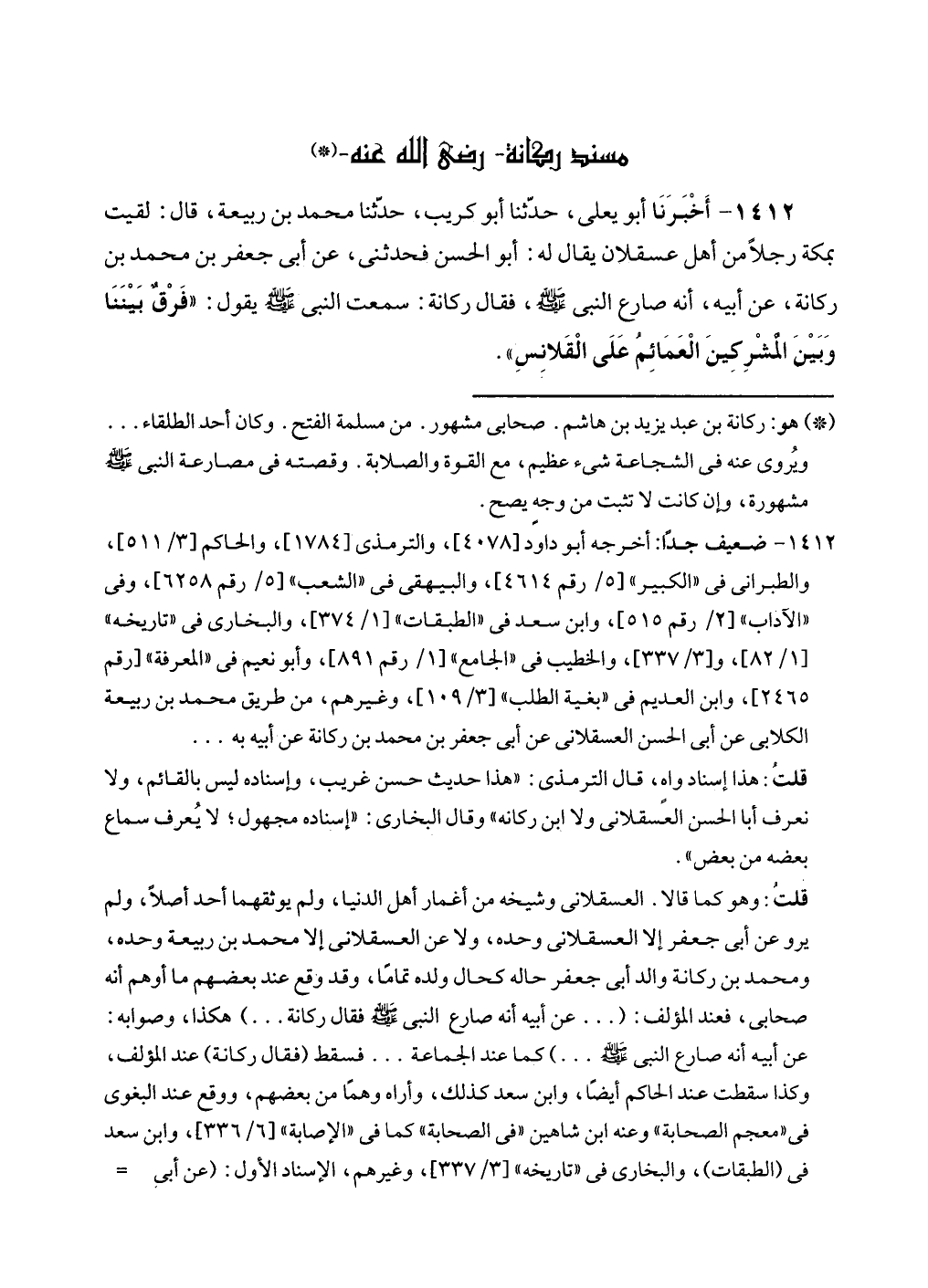 ١٤١٢ - أَخْبَرَنَا أبو يعلى، حدّثنا أبو كريب، حدّثنا محمد بن ربيعة، قال: لقيت بمكة رجلًا من أهل عسقلان يقال له: أبو الحسن فحدثنى، عن أبى جعفر بن محمد بن ركانة، عن أبيه، أنه صارع النبي - صلى الله عليه وسلم -، فقال ركانة: سمعت النبي - صلى الله عليه وسلم - يقول: "فَرْقٌ بَيْنَنَا وَبَيْنَ الْمُشْرِكِينَ الْعَمَائِمُ عَلَى الْقَلانِسِ".