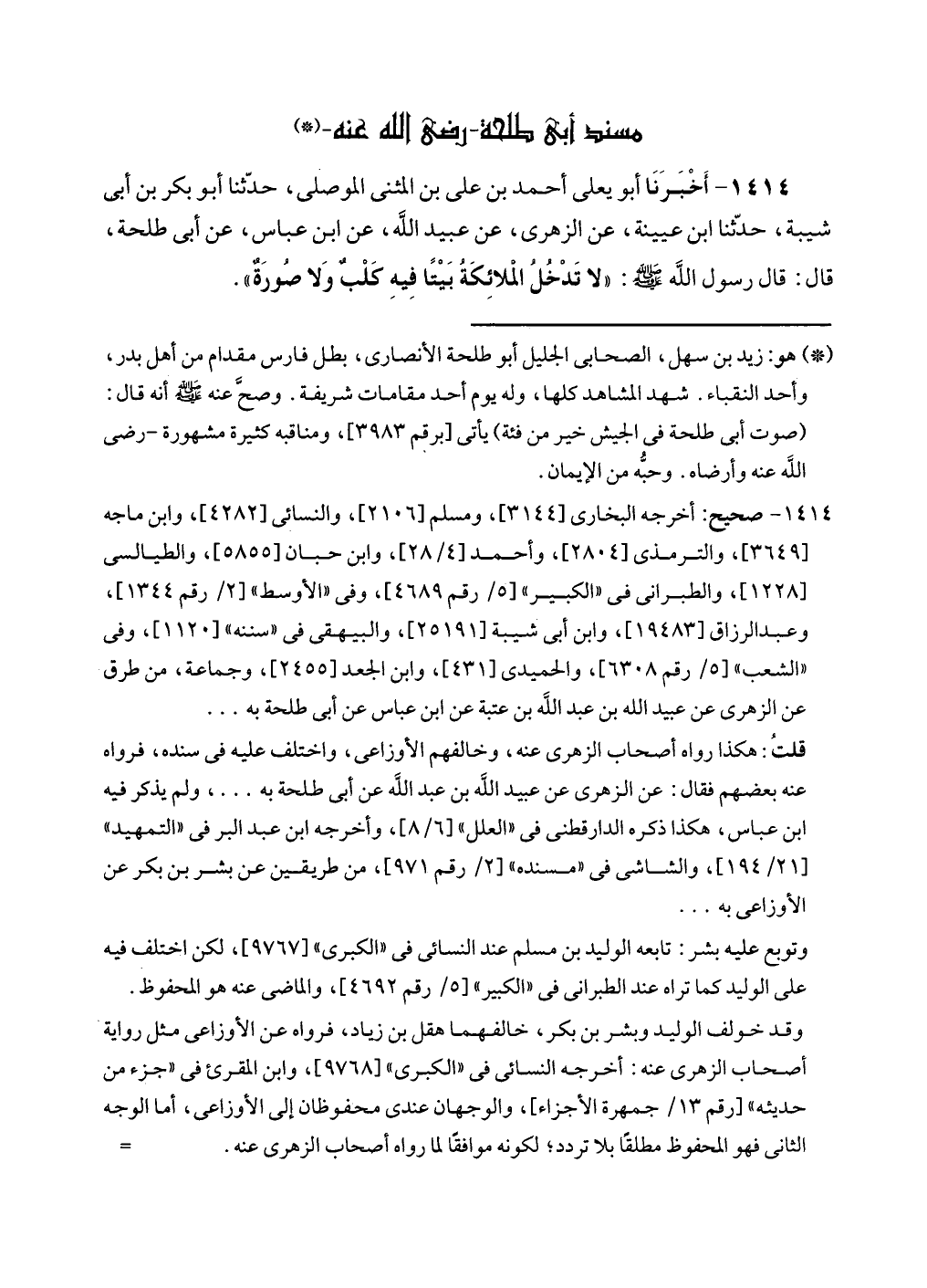 ١٤١٤ - أَخْبَرَنَا أبو يعلى أحمد بن على بن المثنى الموصلى، حدّثنا أبو بكر بن أبى شيبة، حدّثنا ابن عيينة، عن الزهرى، عن عبيد الله، عن ابن عباس، عن أبى طلحة، قال: قال رسول الله - صلى الله عليه وسلم -: "لا تَدْخُلُ الملائِكَةُ بَيْتًا فِيهِ كَلْبٌ وَلا صُورَةٌ".