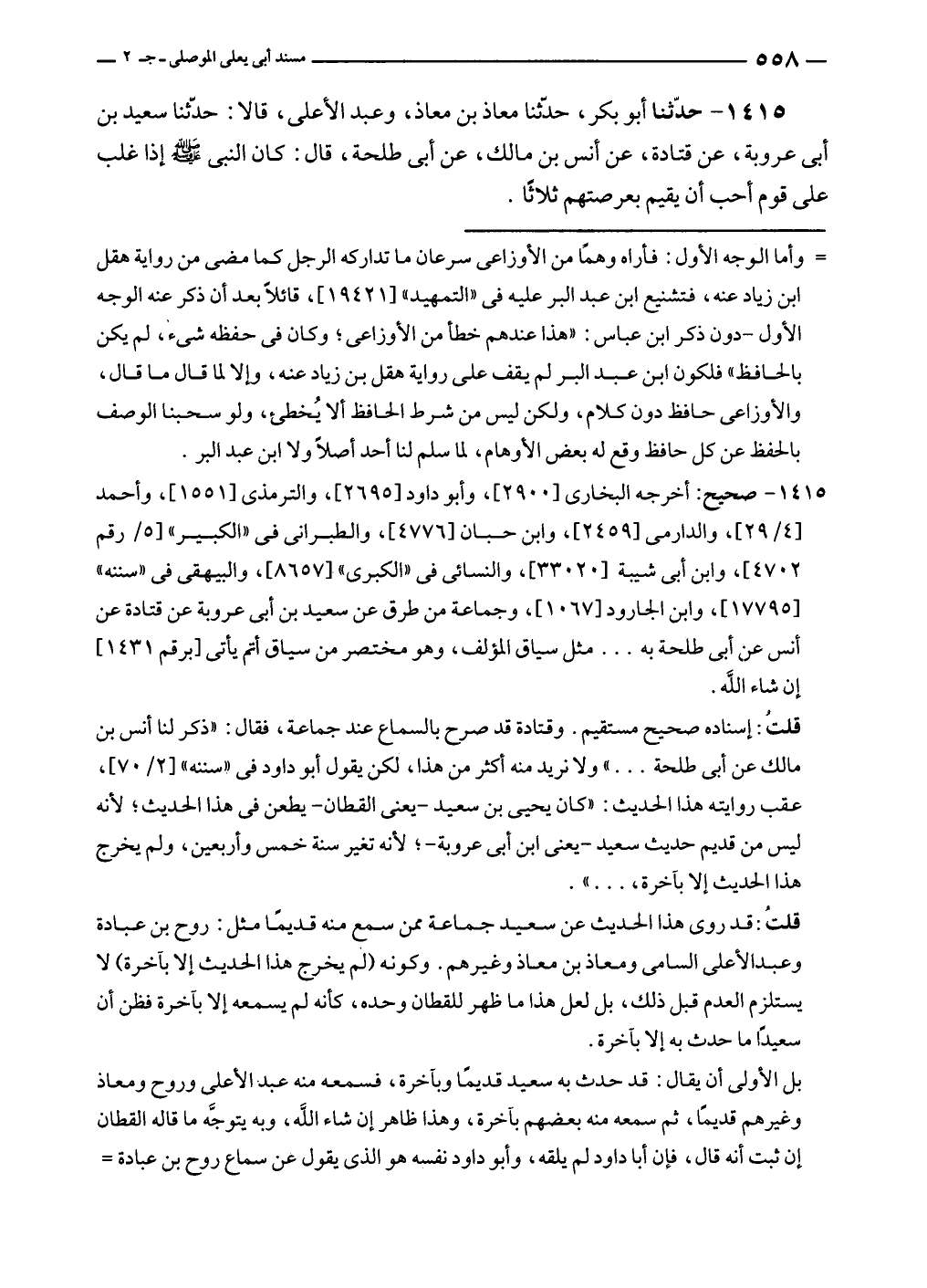 بل الأولى أن يقال: قد حدث به سعيد قديمًا وبآخرة، فسمعه منه عبد الأعلى وروح ومعاذ وغيرهم قديمًا، ثم سمعه منه بعضهم بآخرة، وهذا ظاهر إن شاء الله، وبه يتوجَّه ما قاله القطان إن ثبت أنه قال، فإن أبا داود لم يلقه، وأبو داود نفسه هو الذي يقول عن سماع روح بن عبادة =