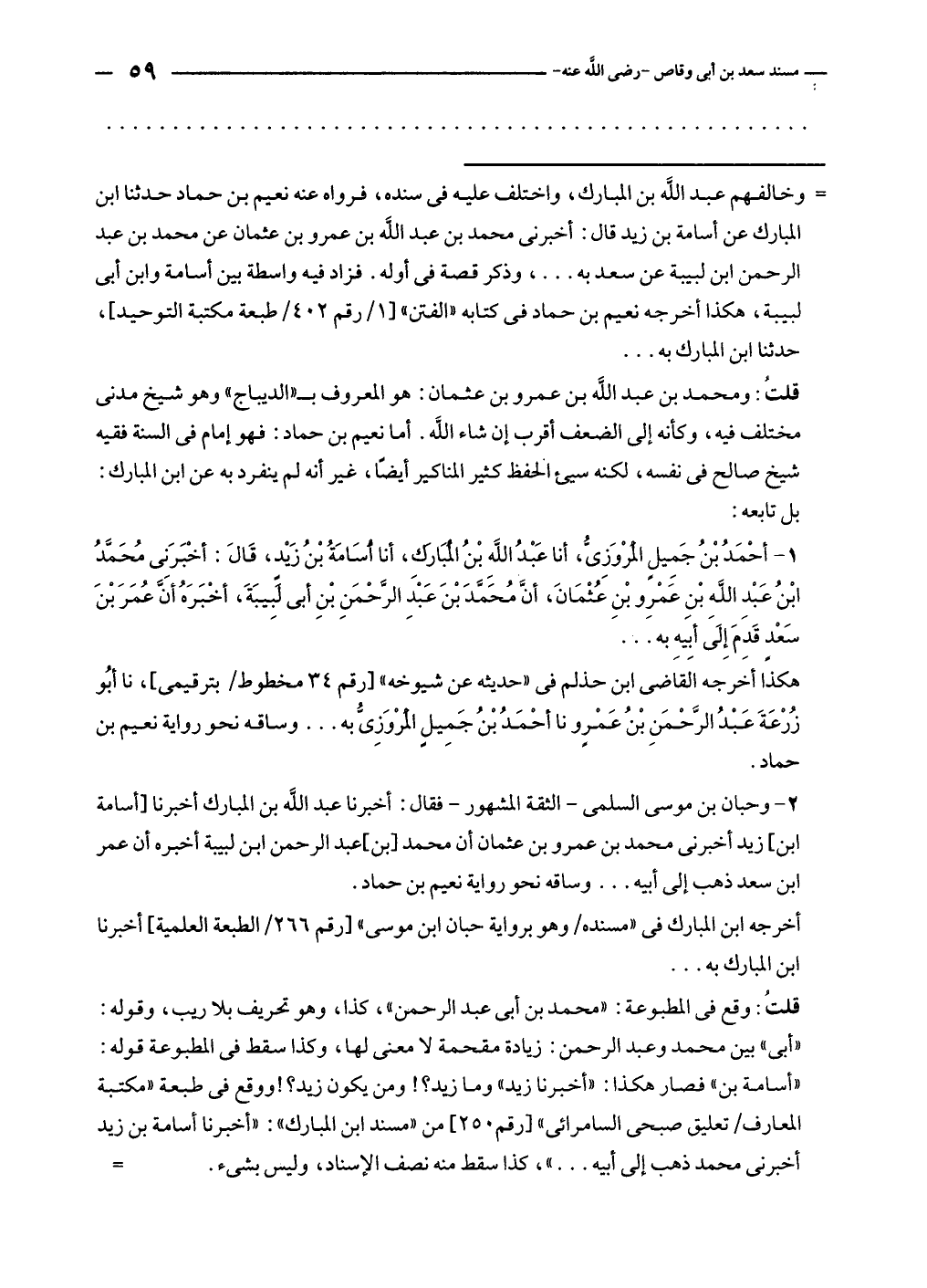= وخالفهم عبد الله بن المبارك، واختلف عليه في سنده، فرواه عنه نعيم بن حماد حدثنا ابن المبارك عن أسامة بن زيد قال: أخبرنى محمد بن عبد الله بن عمرو بن عثمان عن محمد بن عبد الرحمن بن لبيبة عن سعد به ... ، وذكر قصة في أوله. فزاد فيه واسطة بين أسامة وابن أبي لبيبة، هكذا أخرجه نعيم بن حماد في كتابه "الفتن" [١/ رقم ٤٠٢/ طبعة مكتبة التوحيد]، حدثنا ابن المبارك به ...