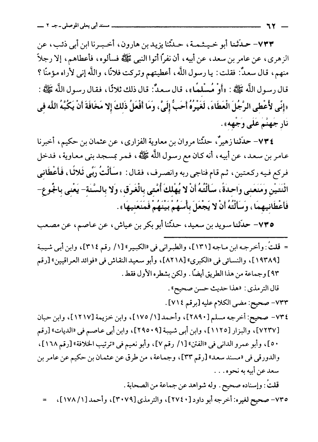 ٧٣٣ - حدّثنا أبو خيثمة، حدثنا يزيد بن هارون، أخبرنا ابن أبي ذئب، عن الزهرى، عن عامر بن سعد، عن أبيه، أن نفرًا أتوا النبي - صلى الله عليه وسلم - فسألوه، فأعطاهم، إلا رجلًا منهم، قال سعد: فقلت: يا رسول الله، أعطيتهم وتركت فلانًا، واللَّه إنى لأراه مؤمنًا؟ قال رسول الله - صلى الله عليه وسلم -: "أَوْ مُسْلِمًا"، قال سعدٌ: قال ذلك ثلاثًا، فقال رسول الله - صلى الله عليه وسلم -: "إِنِّي لأُعْطِى الرَّجُلَ الْعَطَاءَ، لَغَيْرُهُ أَحَبُّ إِلَى، وَمَا أَفْعَلُ ذَلِكَ إِلا مَخَافَةَ أَنْ يَكُبَّهُ الله فِي نارِ جَهنَّم عَلَى وَجْهِهِ".