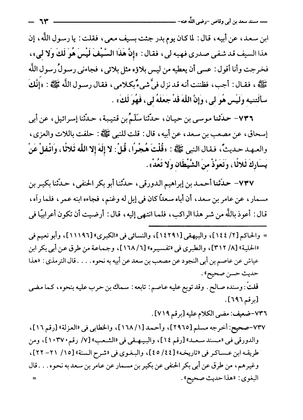 ٧٣٧ - صحيح: أخرجه مسلم [٢٩٦٥]، وأحمد [١/ ١٦٨]، والخطابى في "العزلة" [رقم ١٦]، والدورقي في "مسند سعد" [رقم ١٤]، والبيهقي في "الشعب" [٧/ رقم ١٠٣٧٠]، ومن طريقه ابن عساكر في "تاريخه" [٤٤/ ٤٥]، والبغوي في "شرح السنة" [١٥/ ٢١ - ٢٢]، وغيرهم، من طرق عن أبي بكر الحنفى عن بكير بن مسمار عن عامر بن سعد به نحوه ... قال البغوي: "هذا حديث صحيح". =