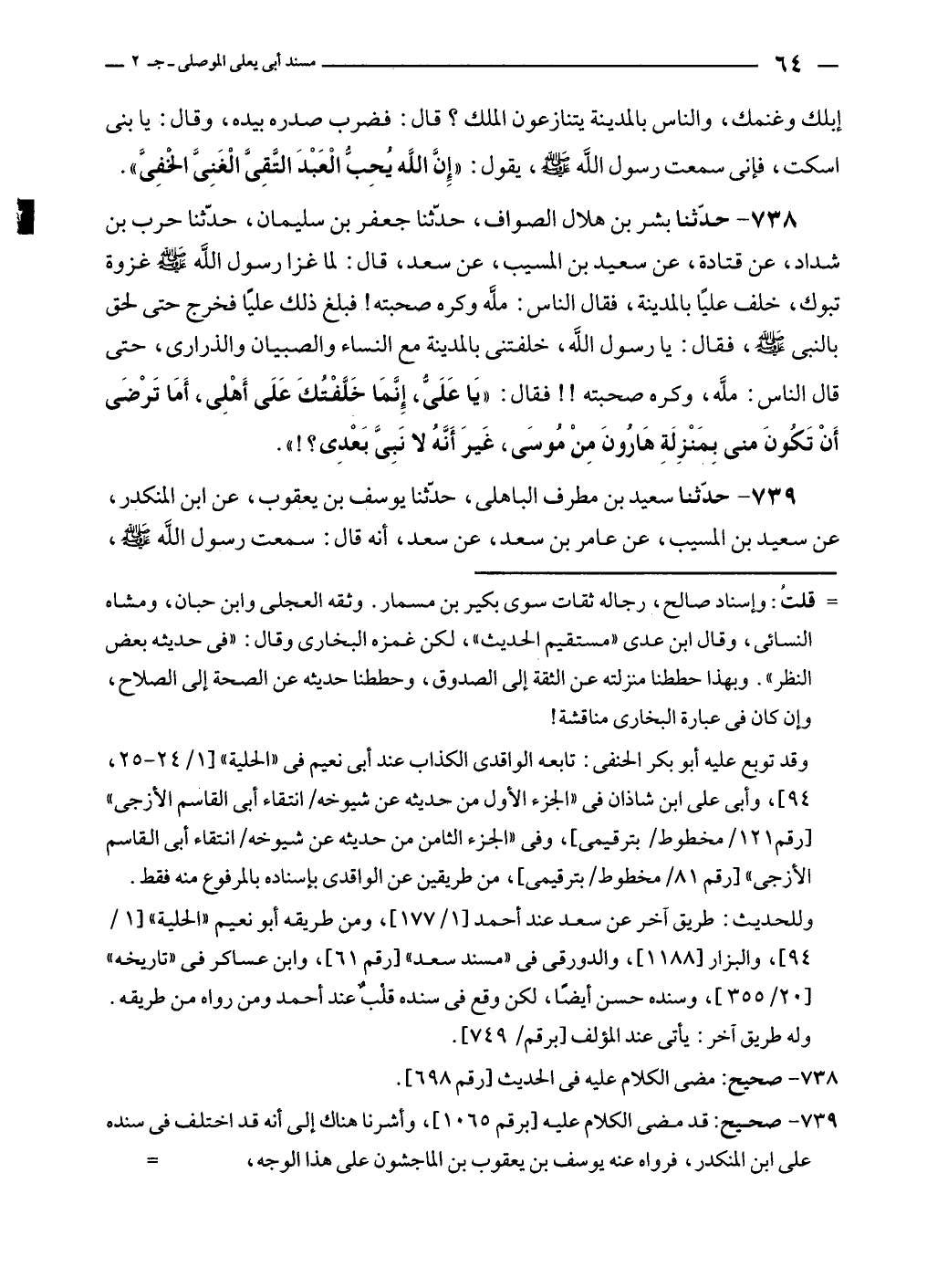 ٧٣٨ - حدّثنا بشر بن هلال الصواف، حدّثنا جعفر بن سليمان، حدّثنا حرب بن شداد، عن قتادة، عن سعيد بن المسيب، عن سعد، قال: لما غزا رسول الله - صلى الله عليه وسلم - غزوة تبوك، خلف عليًا بالمدينة، فقال الناس: ملَّه وكره صحبته! فبلغ ذلك عليًا فخرج حتى لحق بالنبى - صلى الله عليه وسلم -، فقال: يا رسول الله، خلفتنى بالمدينة مع النساء والصبيان والذراري، حتى قال الناس: ملَّه، وكره صحبته!! فقال: "يَا عَلَيّ، إِنَّمَا خَلَّفْتُكَ عَلَى أَهْلِى، أَمَا تَرْضَى أَنْ تَكُونَ منى بِمنْزِلَةِ هَارُونَ مِنْ مُوسَى، غَيرَ أَنَّهُ لا نَبِيَّ بَعْدِى؟! ".