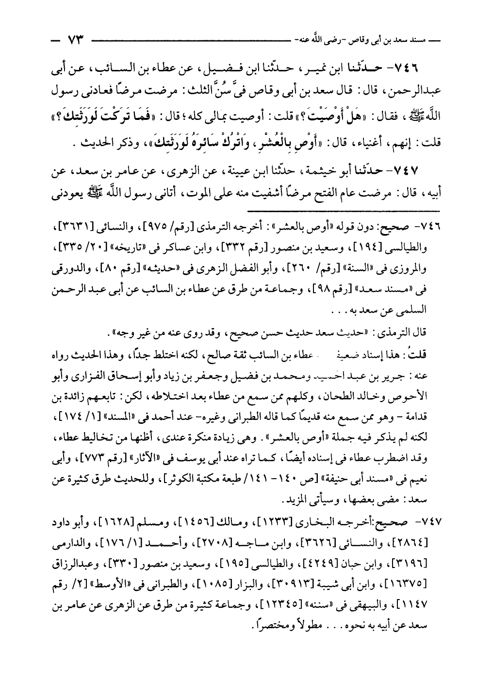 ٧٤٦ - صحيح: دون قوله "أوص بالعشر": أخرجه الترمذي [رقم/ ٩٧٥]، والنسائي [٣٦٣١]، والطيالسي [١٩٤]، وسعيد بن منصور [رقم ٣٣٢]، وابن عساكر في "تاريخه" [٢٠/ ٣٣٥]، والمروزى في "السنة" [رقم/ ٢٦٠]، وأبو الفضل الزهرى في "حديثه" [رقم ٨٠]، والدورقي في "مسند سعد" [رقم ٩٨]، وجماعة من طرق عن عطاء بن السائب عن أبي عبد الرحمن السلمى عن سعد به ...