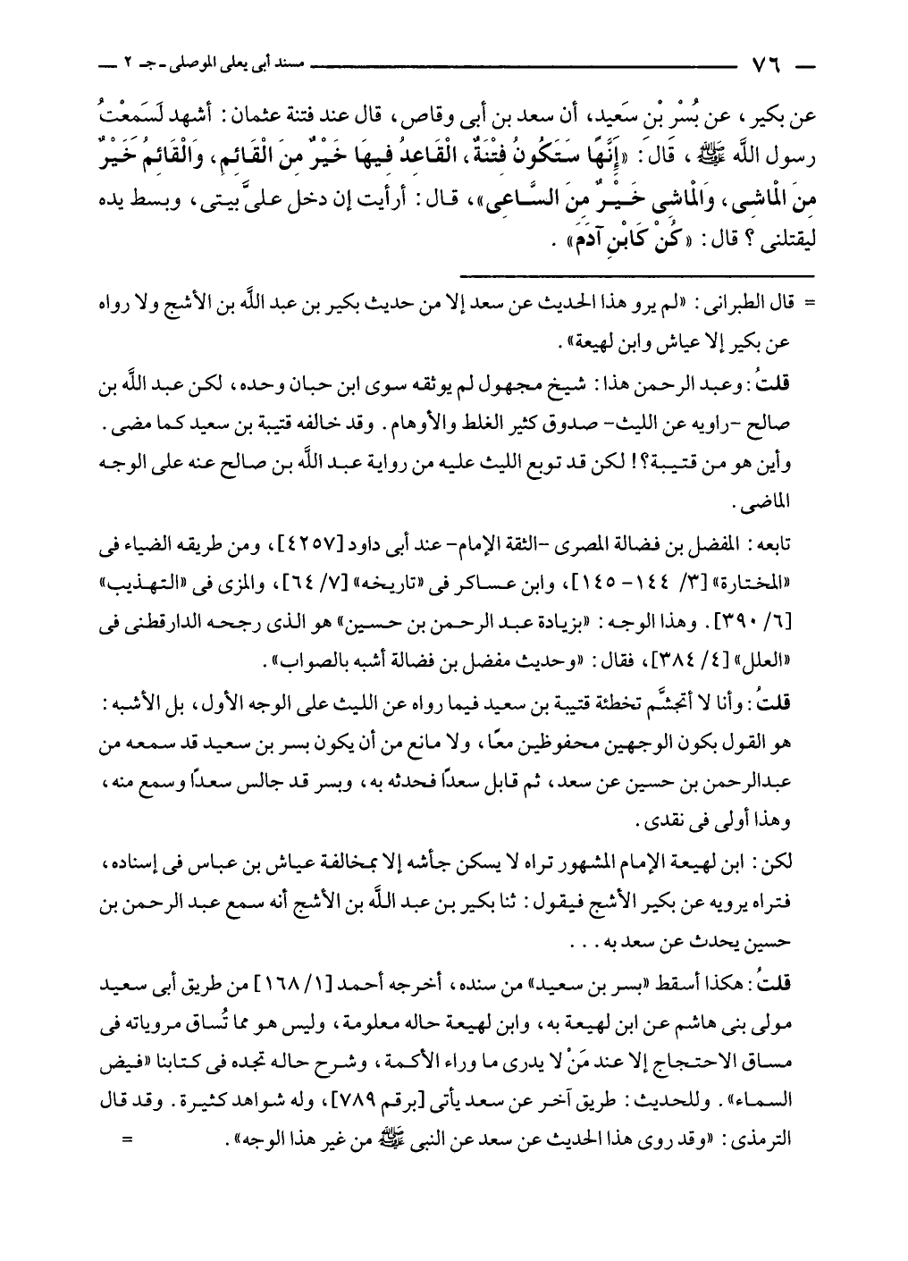 عن بكير، عن بُسْر بْن سَعيدٍ، أن سعد بن أبي وقاص، قال عند فتنة عثمان: أشهد لَسَمعْتُ رسول الله - صلى الله عليه وسلم -، قَالَ: "إنَّها سَتَكونُ فِتْنَةٌ، الْقَاعِدُ فيهَا خَيْرٌ مِنَ الْقَائِمِ، وَالْقَائِمُ خَيْرٌ مِنَ الماشِى، وَالماشِى خَيْرٌ مِنَ السَّاعِي"، قال: أرأَيت إن دخل عليَّ بيتى، وبسط يده ليقتلنى؟ قال: "كنْ كَابْنِ آدَمَ".