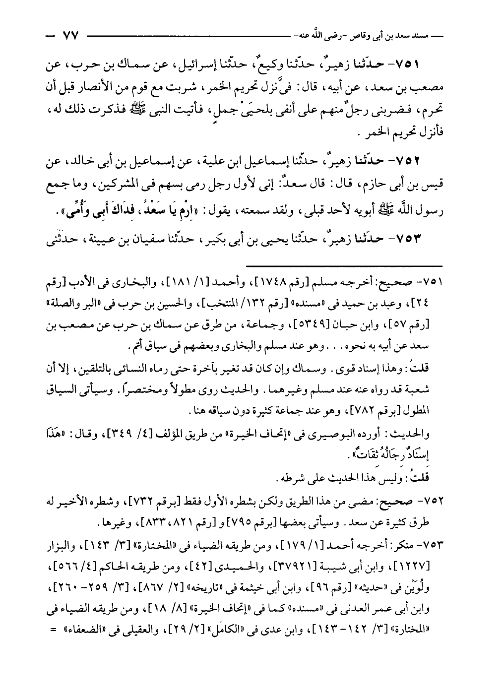 ٧٥١ - حدّثنا زهيرٌ، حدّثنا وكيعٌ، حدّثنا إسرائيل، عن سماك بن حرب، عن مصعب بن سعد، عن أبيه، قال: فيَّ نزل تحريم الخمر، شربت مع قوم من الأنصار قبل أن تحرم، فضربنى رجلٌ منهم على أنفى بلحيَىْ جملٍ، فأتيت النبي - صلى الله عليه وسلم - فذكرت ذلك له، فأنزل تحريم الخمر.