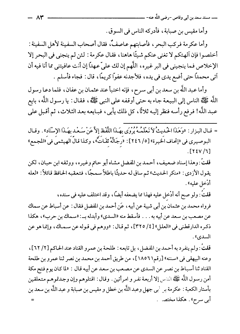 قلتُ: ولم ينفرد به أحمد بن المفضل، بل تابعه: طلحة بن عمرو القناد عند الحاكم [٢/ ٦٢]، وعنه البيهقي في "سننه" [رقم ١٨٥٦١]، من طريق أحمد بن محمد بن نصر ثنا عمرو بن طلحة القناد ثنا أسباط بن نصر عن السدي عن مصعب بن سعد عن أبيه قال: "لما كان يوم فتح مكة أمن رسول الله - صلى الله عليه وسلم - الناس إلا أربعة نفر وامرأتين. وقال: اقتلوهم وإن وجدتموهم متعلقين بأستار الكعبة: عكرمة بن أبي جهل وعبد الله بن خطل ومقيس بن صبابة وعبد الله بن سعد بن أبي سرح". هكذا مختصرًا. =