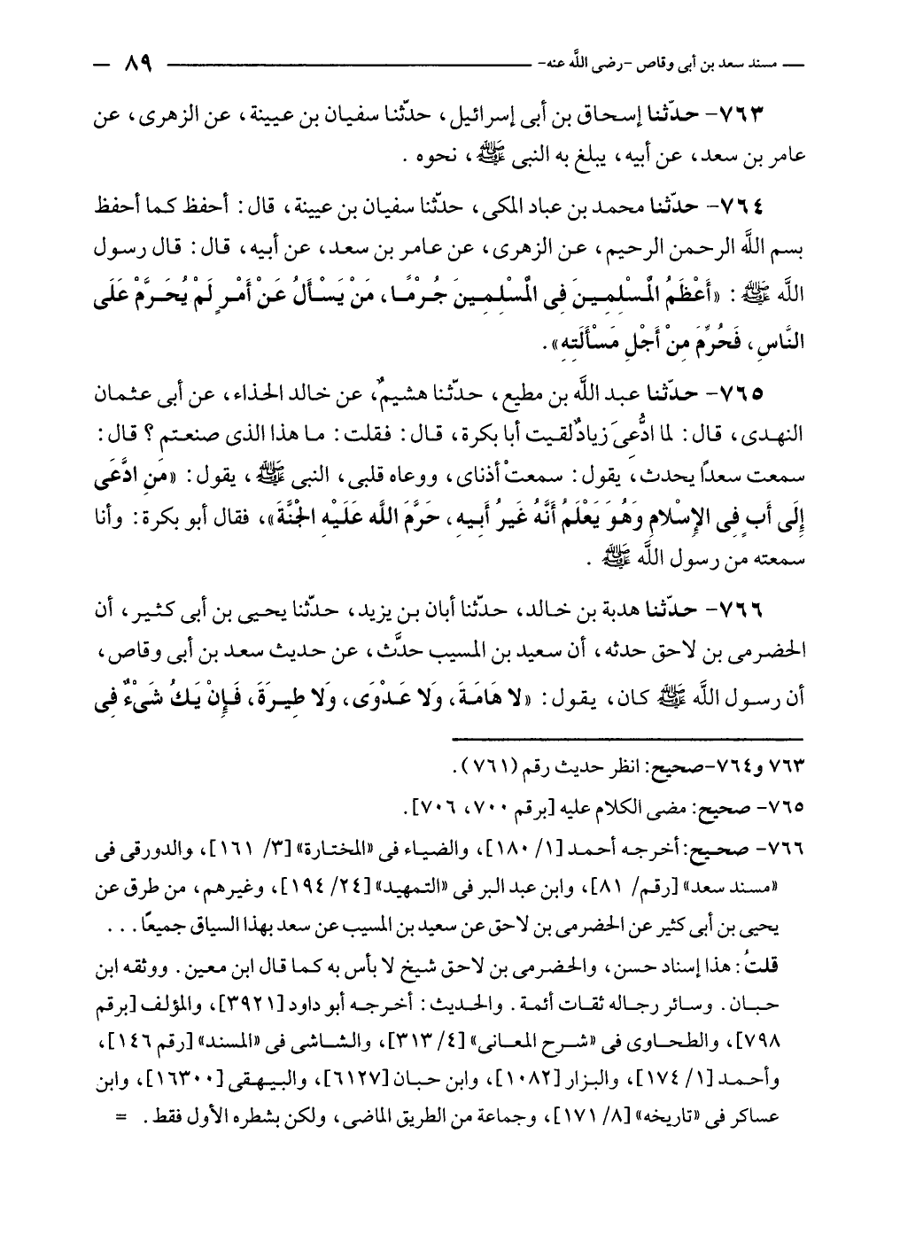 ٧٦٦ - صحيح: أخرجه أحمد [١/ ١٨٠]، والضياء في "الختارة" [٣/ ١٦١]، والدورقي في "مسند سعد" [رقم/ ٨١]، وابن عبد البر في "التمهيد" [٢٤/ ١٩٤]، وغيرهم، من طرق عن يحيى بن أبي كثير عن الحضرمي بن لاحق عن سعيد بن المسيب عن سعد بهذا السياق جميعًا ...