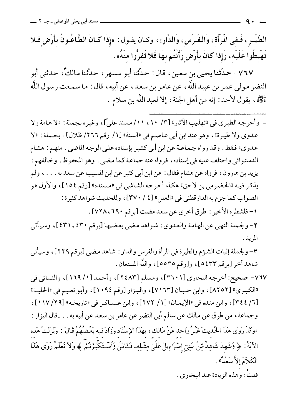 ٧٦٧ - حدّثنا يحيى بن معين، قال: حدّثنا أبو مسهر، حدّثنا مالكٌ، حدثني أبو النضر مولى عمر بن عبيد الله، عن عامر بن سعد، عن أبيه، قال: ما سمعت رسول الله - صلى الله عليه وسلم -، يقول لأحد: إنه من أهل الجنة، إلا لعبد الله بن سلام.