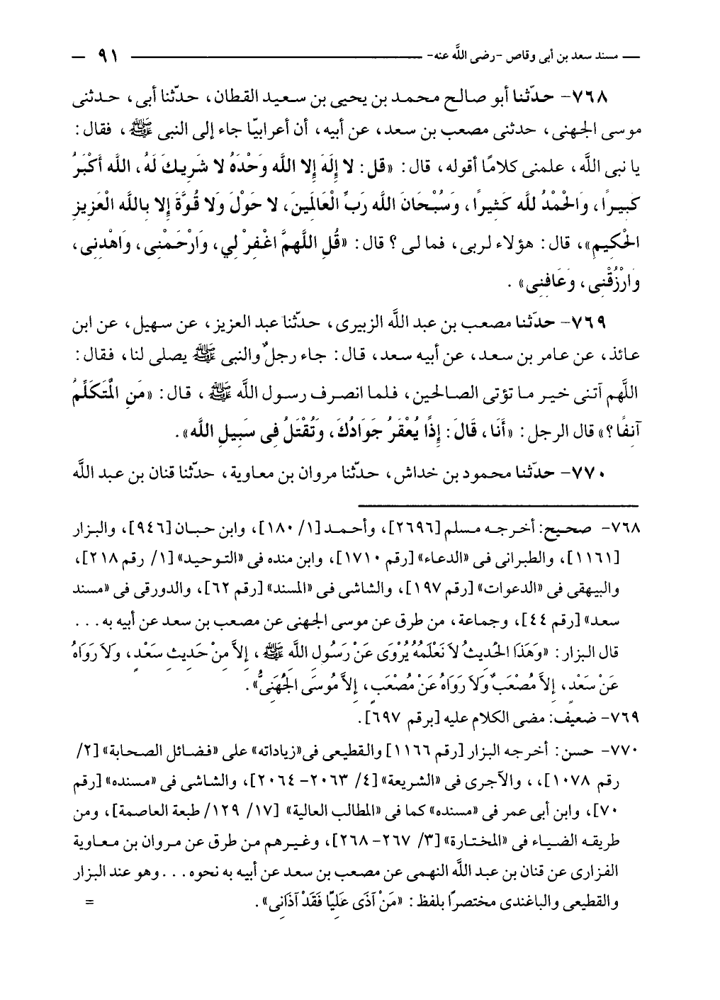 ٧٦٨ - حدّثنا أبو صالح محمد بن يحيى بن سعيد القطان، حدّثنا أبي، حدثني موسى الجهني، حدثني مصعب بن سعد، عن أبيه، أن أعرابيّا جاء إلى النبي - صلى الله عليه وسلم -، فقال: يا نبى الله، علمنى كلامًا أقوله، قال: "قل: لا إِلَهَ إِلا الله وَحْدَهُ لا شَرِيكَ لَهُ، الله أَكْبَر كبيرًا، وَالحَمْدُ للَّه كَثِيرًا، وَسُبْحَانَ الله رَبِّ الْعَالمَينَ، لا حَوْلَ وَلا قُوَّةَ إِلا بِاللَّه الْعَزِيزِ الحَكِيمِ"، قال: هولاء لربى، فما لى؟ قال: "قُلِ اللَّهمَ اغْفِرْ لِي، وَارْحَمْنِى، وَاهْدِنِى، وارْزُقْنِى، وَعَافنِى".