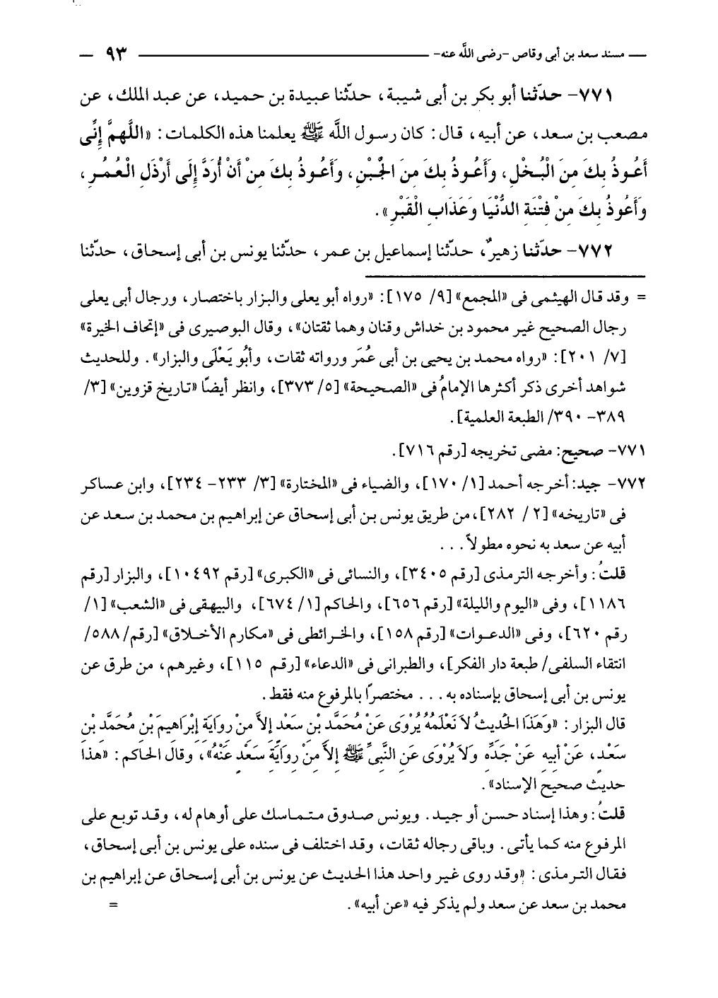 ٧٧١ - حدّثنا أبو بكر بن أبي شيبة، حدّثنا عبيدة بن حميد، عن عبد الملك، عن مصعب بن سعد، عن أبيه، قال: كان رسول الله - صلى الله عليه وسلم - يعلمنا هذه الكلمات: "اللَّهمَّ إِنِّي أَعُوذُ بِكَ مِنَ الْبُخْلِ، وَأَعُوذُ بِكَ مِنَ الجبْنِ، وَأَعُوذُ بِكَ مِنْ أَنْ أُرَدَّ إِلَى أَرْذَلِ الْعُمُرِ، وَأَعُوذُ بِك مِنْ فِتْنَةِ الدُّنْيَا وَعَذَابِ الْقَبْرِ".