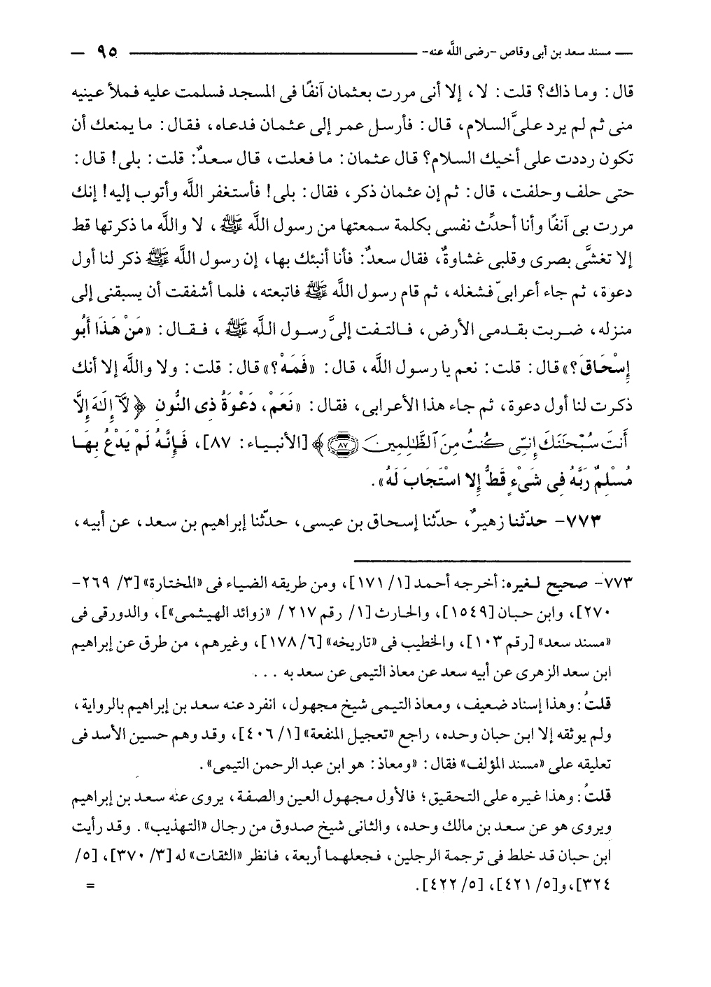 ٧٧٣ - صحيح لغيره: أخرجه أحمد [١/ ١٧١]، ومن طريقه الضياء في "المختارة" [٣/ ٢٦٩ - ٢٧٠]، وابن حبان [١٥٤٩]، والحارث [١/ رقم ٢١٧/ "زوائد الهيثمى"]، والدورقى في "مسند سعد" [رقم ١٠٣]، والخطيب في "تاريخه" [٦/ ١٧٨]، وغيرهم، من طرق عن إبراهيم بن سعد الزهرى عن أبيه سعد عن معاذ التيمى عن سعد به ...