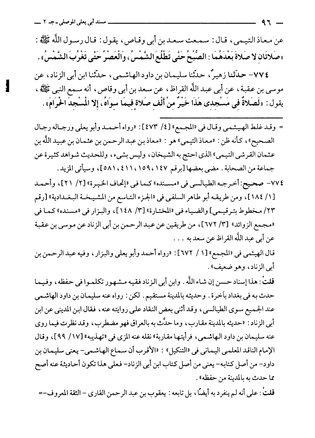 ٧٧٤ - صحيح: أخرجه الطيالسى في "مسنده" كما في "إتحاف الخيرة" [٢/ ٢١]، وأحمد [١/ ١٨٤]، ومن طريقه أبو طاهر السلفى في "الجزء التاسع من المشيخة البغدادية" [رقم ٢٣/ مخطوط بترقيمى] والضياء في "المختارة" [١/ ١٤٨]، والبزار في "مسنده" كما في "مجمع الزوائد" [١/ ٦٧٢]، من طريقين عن عبد الرحمن بن أبى الزناد عن موسى بن عقبة عن أبى عبد الله القراظ عن سعد به ...