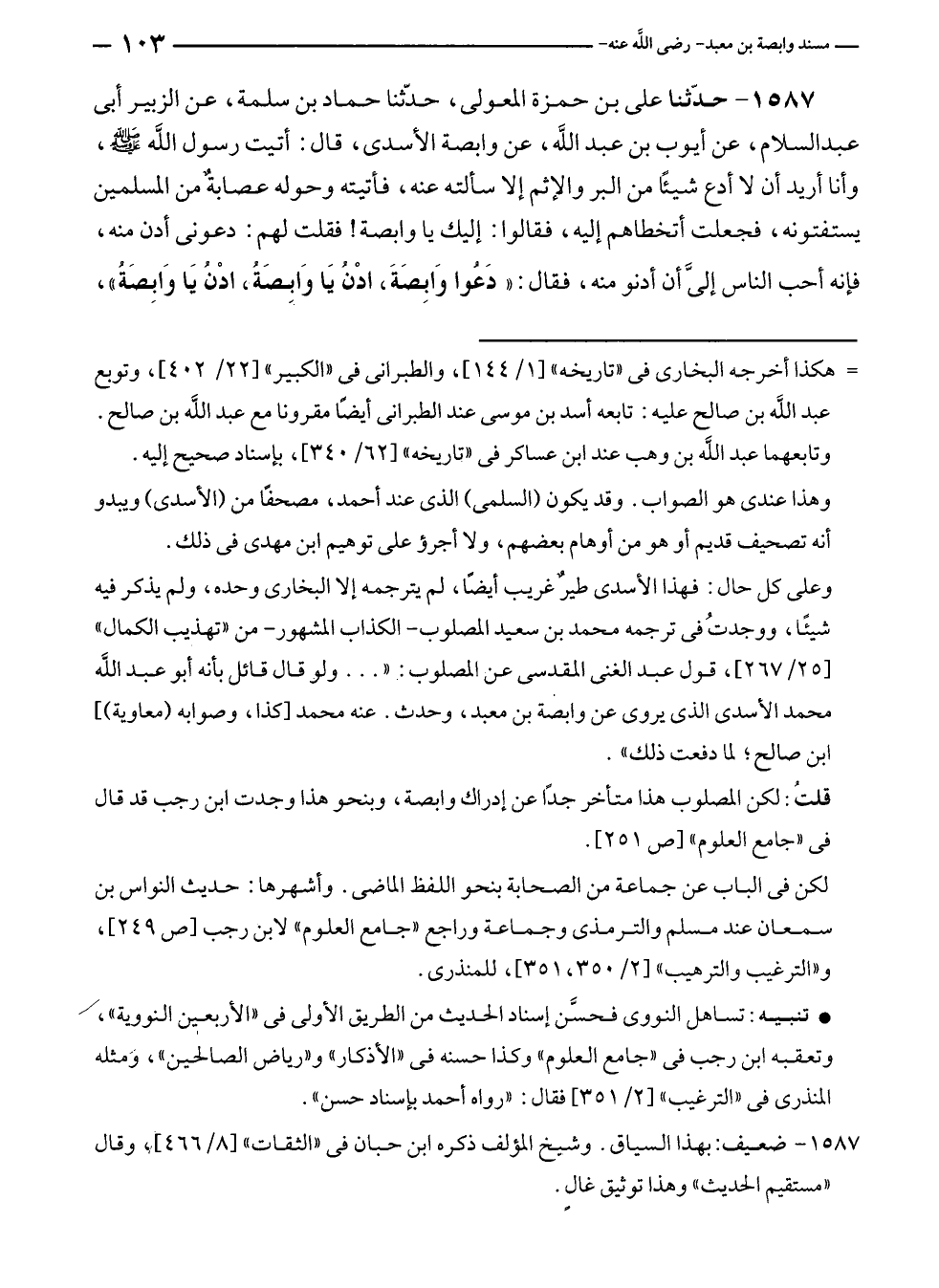١٥٨٧ - حدّثنا على بن حمزة المعولى، حدّثنا حماد بن سلمة، عن الزبير أبى عبد السلام، عن أيوب بن عبد الله، عن وابصة الأسدى، قال: أتيت رسول الله - صلى الله عليه وسلم -، وأنا أريد أن لا أدع شيئًا من البر والإثم إلا سألته عنه، فأتيته وحوله عصابةٌ من المسلمين يستفتونه، فجعلت أتخطاهم إليه، فقالوا: إليك يا وابصة! فقلت لهم: دعونى أدن منه، فإنه أحب الناس إليَّ أن أدنو منه، فقال: "دَعُوا وَابِصَةَ، ادْنُ يَا وَابِصَةُ، ادْنُ يَا وَابِصَةُ"،