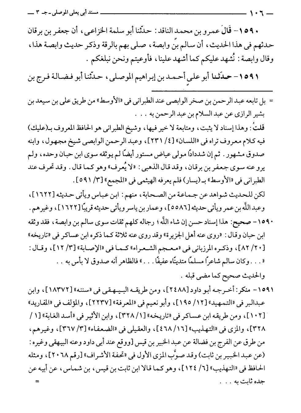 ١٥٩٠ - صحيح: هذا إسناد حسن إن شاء الله؛ رجاله كلهم ثقات سوى سالم بن وابصة، فقد وثقه ابن حبان وقال: "روى عنه أهل الجزيرة" وقد روى عنه ثلاثة كما ذكره ابن عساكر في "تاريخه" [٢٠/ ٨٢]، وذكره المرزبانى في "معجم الشعراء" كما في "الإصابة" [٣/ ١٢]، وقال: " ... وكان سالم شاعرًا مسلمًا متدينًا عفيفًا ... " فالظاهر أنه صدوق لا بأس به ..