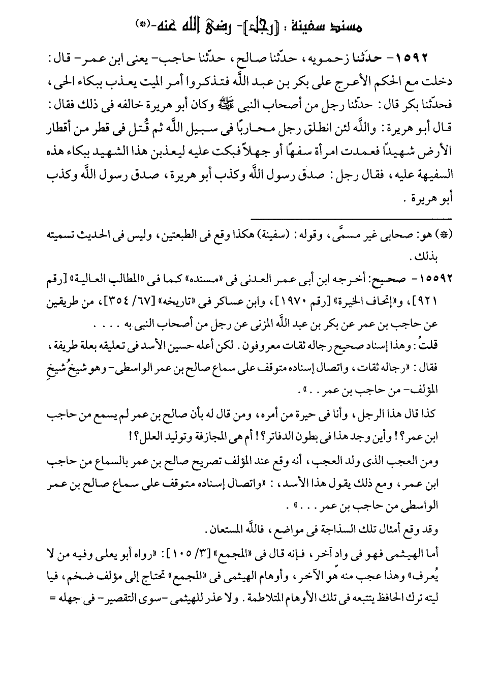 ١٥٩٢ - حدّثنا زحمويه، حدّثنا صالح، حدّثنا حاجب - يعنى ابن عمر - قال: دخلت مع الحكم الأعرج على بكر بن عبد الله فتذكروا أمر الميت يعذب ببكاء الحى، فحدّثنا بكر قال: حدّثنا رجل من أصحاب النبي - صلى الله عليه وسلم - وكان أبو هريرة خالفه في ذلك فقال: قال أبو هريرة: والله لئن انطلق رجل محاربًا في سبيل الله ثم قُتل في قطر من أقطار الأرض شهيدًا فعمدت امرأة سفهًا أو جهلًا فبكت عليه ليعذبن هذا الشهيد ببكاء هذه السفيهة عليه، فقال رجل: صدق رسول الله وكذب أبو هريرة، صدق رسول الله وكذب أبو هريرة.