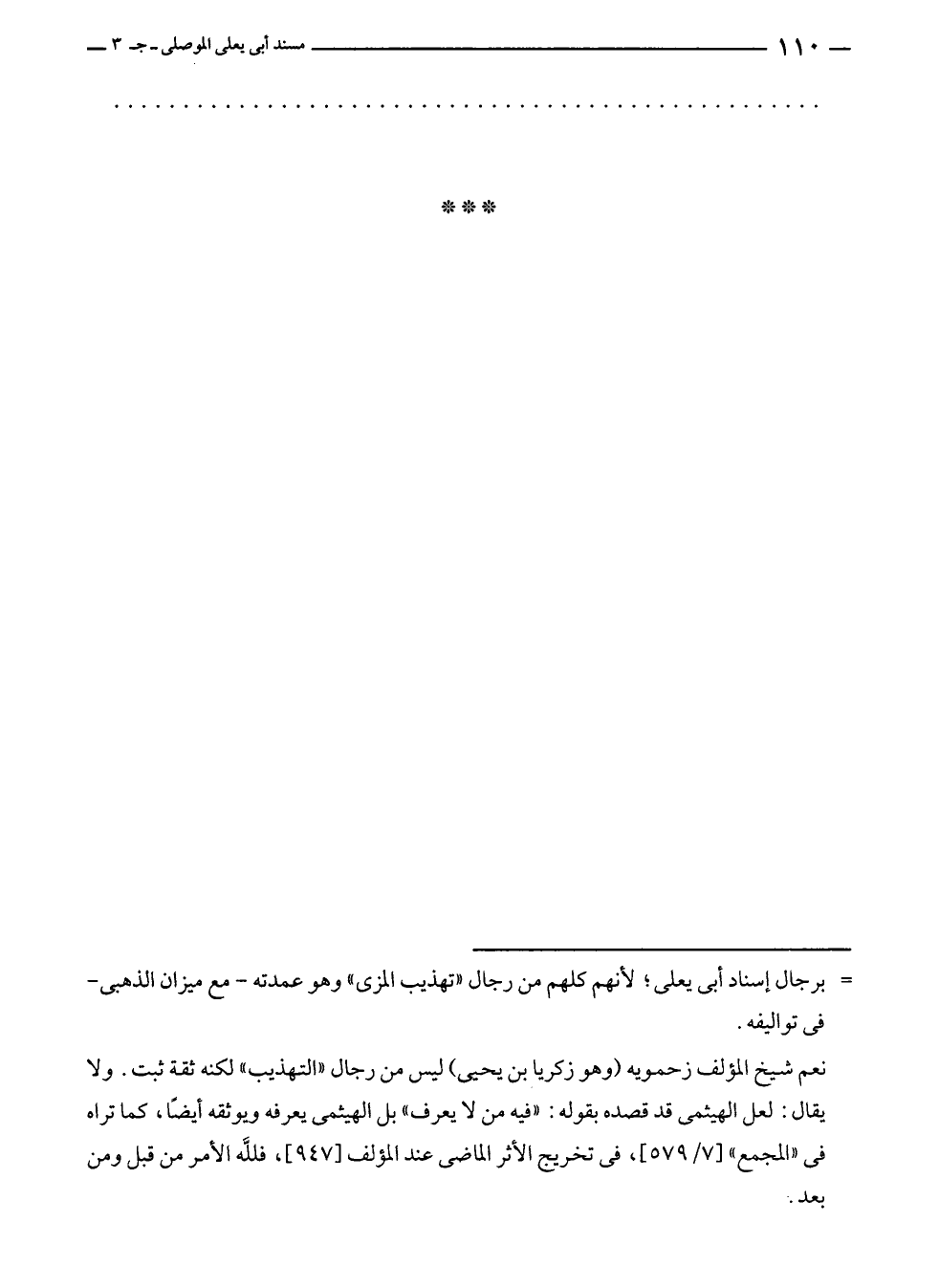 نعم شيخ المؤلف زحمويه (وهو زكريا بن يحيى) ليس من رجال "التهذيب" لكنه ثقة ثبت. ولا يقال: لعل الهيثمى قد قصده بقوله: "فيه من لا يعرف" بل الهيثمى يعرفه ويوثقه أيضًا، كما تراه في "المجمع" [٧/ ٥٧٩]، في تخريج الأثر الماضى عند المؤلف [٩٤٧]، فللَّه الأمر من قبل ومن بعد.