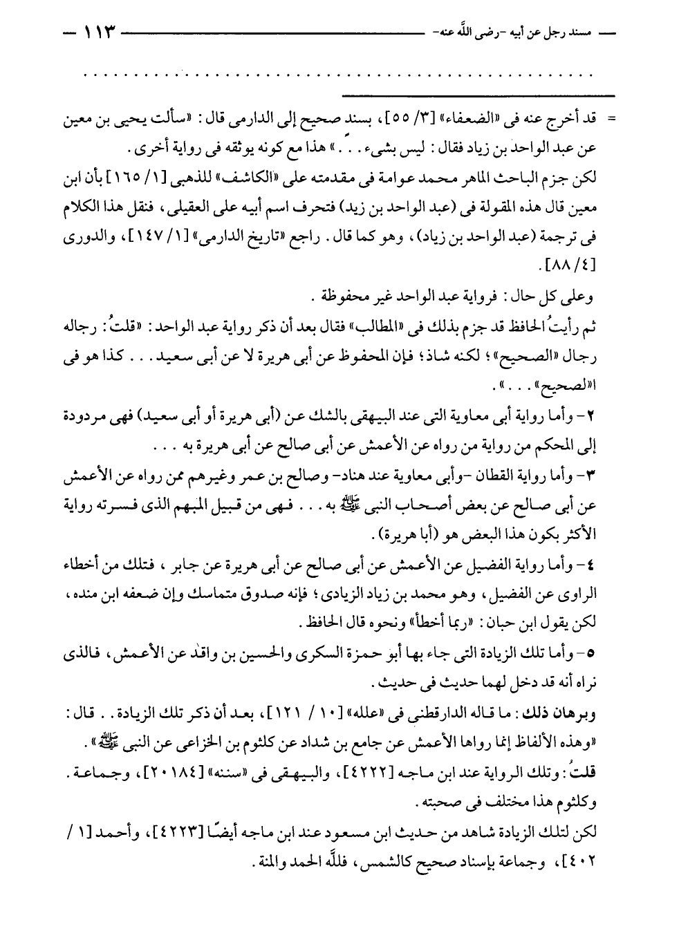 ٣ - وأما رواية القطان - وأبى معاوية عند هناد - وصالح بن عمر وغيرهم ممن رواه عن الأعمش عن أبى صالح عن بعض أصحاب النبي - صلى الله عليه وسلم - به ... فهى من قبيل المبهم الذي فسرته رواية الأكثر بكون هذا البعض هو (أبا هريرة).