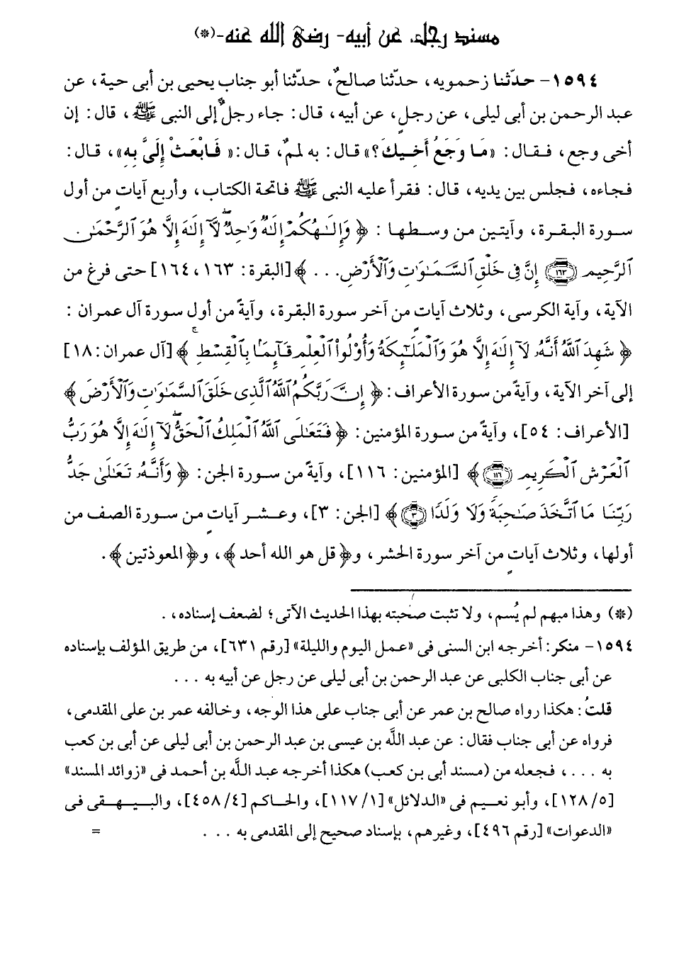 ١٥٩٤ - حدّثنا زحمويه، حدّثنا صالحٌ، حدّثنا أبو جناب يحيى بن أبى حية، عن عبد الرحمن بن أبى ليلى، عن رجلٍ، عن أبيه، قال: جاء رجلٌ إلى النبي - صلى الله عليه وسلم -، قال: إن أخى وجع، فقال: "مَا وَجَعُ أَخِيكَ؟ " قال: به لممٌ، قال: "فَابْعَثْ إِلَيَّ بِهِ"، قال: فجاءه، فجلس بين يديه، قال: فقرأ عليه النبي - صلى الله عليه وسلم - فاتحة الكتاب، وأربع آياتٍ من أول سورة البقرة، وآيتين من وسطها: {وَإِلَهُكُمْ إِلَهٌ وَاحِدٌ لَا إِلَهَ إِلَّا هُوَ الرَّحْمَنُ الرَّحِيمُ (١٦٣) إِنَّ فِي خَلْقِ السَّمَاوَاتِ وَالْأَرْضِ ... } [البقرة: ١٦٣، ١٦٤] حتى فرغ من الآية، وآية الكرسى، وثلاث آيات من آخر سورة البقرة، وآيةً من أول سورة آل عمران: {شَهِدَ اللَّهُ أَنَّهُ لَا إِلَهَ إِلَّا هُوَ وَالْمَلَائِكَةُ وَأُولُو الْعِلْمِ قَائِمًا بِالْقِسْطِ} [آل عمران: ١٨] إلى آخر الآية، وآيةً من سورة الأعراف: {إِنَّ رَبَّكُمُ اللَّهُ الَّذِي خَلَقَ السَّمَاوَاتِ وَالْأَرْضَ} [الأعراف: ٥٤]، وآيةً من سورة المؤمنين: {فَتَعَالَى اللَّهُ الْمَلِكُ الْحَقُّ لَا إِلَهَ إِلَّا هُوَ رَبُّ الْعَرْشِ الْكَرِيمِ (١١٦)} [المؤمنين: ١١٦]، وآيةً من سورة الجن: {وَأَنَّهُ تَعَالَى جَدُّ رَبِّنَا مَا اتَّخَذَ صَاحِبَةً وَلَا وَلَدًا (٣)} [الجن: ٣]، وعشر آياتٍ من سورة الصف من أولها، وثلاث آياتٍ من آخر سورة الحشر، و {قُلْ هُوَ اللَّهُ أَحَدٌ}، و (المعوذتين).