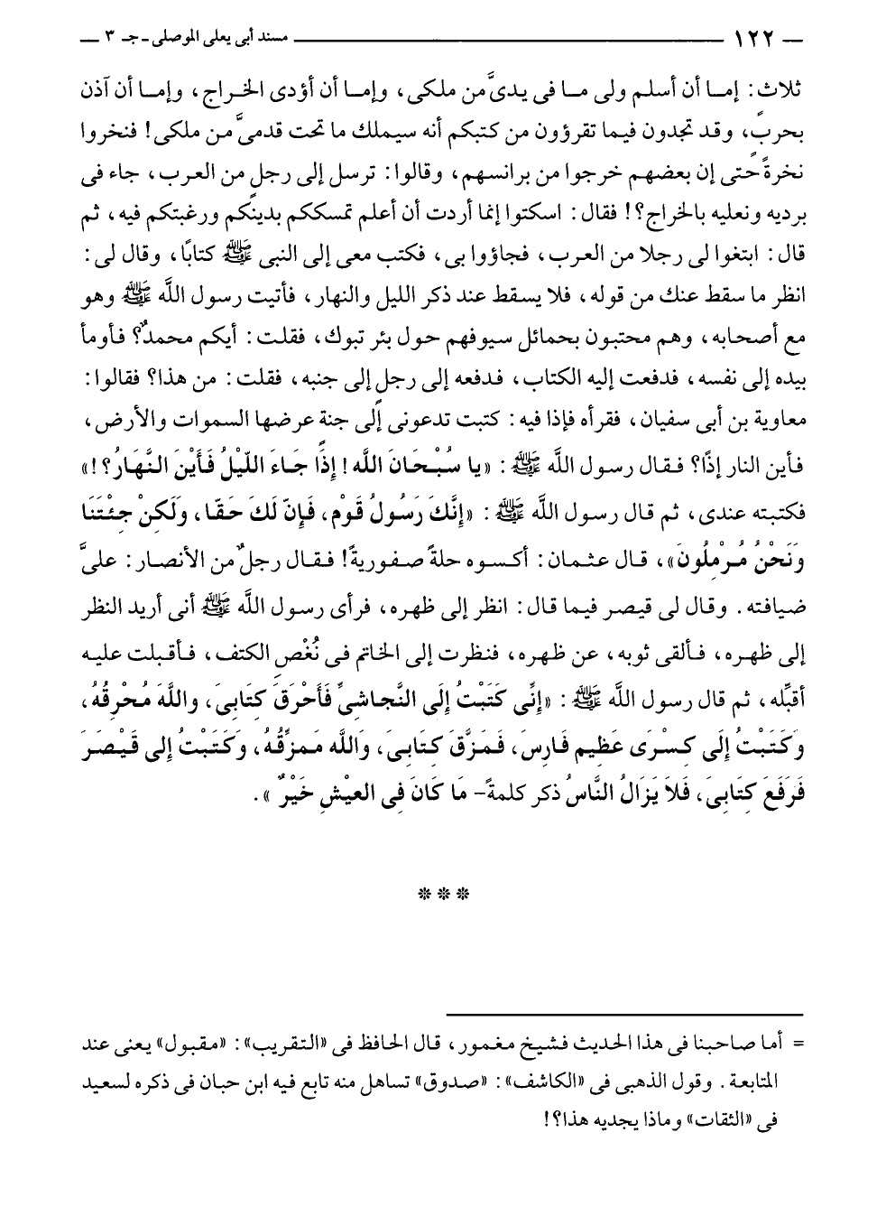 ثلاثٍ: إما أن أسلم ولى ما في يديَّ من ملكى، وإما أن أؤدى الخراج، وإما أن آذن بحربٍ، وقد تجدون فيما تقرؤون من كتبكم أنه سيملك ما تحت قدميَّ من ملكى! فنخروا نخرةً حتى إن بعضهم خرجوا من برانسهم، وقالوا: ترسل إلى رجلٍ من العرب، جاء في برديه ونعليه بالخراج؟! فقال: اسكتوا إنما أردت أن أعلم تمسككم بدينكم ورغبتكم فيه، ثم قال: ابتغوا لى رجلا من العرب، فجاؤوا بى، فكتب معى إلى النبي - صلى الله عليه وسلم - كتابًا، وقال لى: انظر ما سقط عنك من قوله، فلا يسقط عند ذكر الليل والنهار، فأتيت رسول الله - صلى الله عليه وسلم - وهو مع أصحابه، وهم محتبون بحمائل سيوفهم حول بئر تبوك، فقلت: أيكم محمدٌ؟ فأومأ بيده إلى نفسه، فدفعت إليه الكتاب، فدفعه إلى رجلٍ إلى جنبه، فقلت: من هذا؟ فقالوا: معاوية بن أبى سفيان، فقرأه فإذا فيه: كتبت تدعونى إلى جنة عرضها السموات والأرض، فأين النار إذًا؟ فقال رسول الله - صلى الله عليه وسلم -: "يا سُبْحَانَ الله! إِذًا جَاءَ اللّيْلُ فَأَيْنَ النَّهَارُ؟! " فكتبته عندى، ثم قال رسول الله - صلى الله عليه وسلم -: "إِنَّكَ رَسُولُ قَوْم، فَإِنّ لَكَ حَقّا، وَلَكِنْ جِئْتَنَا وَنَحْنُ مُرْمِلُونَ"، قال عثمان: أكسوه حلةً صفوريةً! فقال رجلٌ من الأنصار: عليَّ ضيافته. وقال لى قيصر فيما قال: انظر إلى ظهره، فرأى رسول الله - صلى الله عليه وسلم - أنى أريد النظر إلى ظهره، فألقى ثوبه، عن ظهره، فنظرت إلى الخاتم في نُغْصِ الكتف، فأقبلت عليه أقبِّله، ثم قال رسول الله - صلى الله عليه وسلم -: "إِنِّي كَتَبْتُ إِلَى النَّجاشِيِّ فَأَحْرَقَ كِتَابِي، واللهَ مُحْرِقُهُ، وَكَتَبْتُ إِلَى كِسْرَى عَظِيم فَارِسَ، فَمَزَّق كِتَابِىَ، وَالله مَمزِّقُهُ، وَكتَبْتُ إِلى قَيْصَرَ فَرَفَعَ كِتَابِىَ، فَلا يَزَالُ النَّاسُ ذكر كلمةً - مَا كَانَ فِي العيْشِ خَيْرٌ".