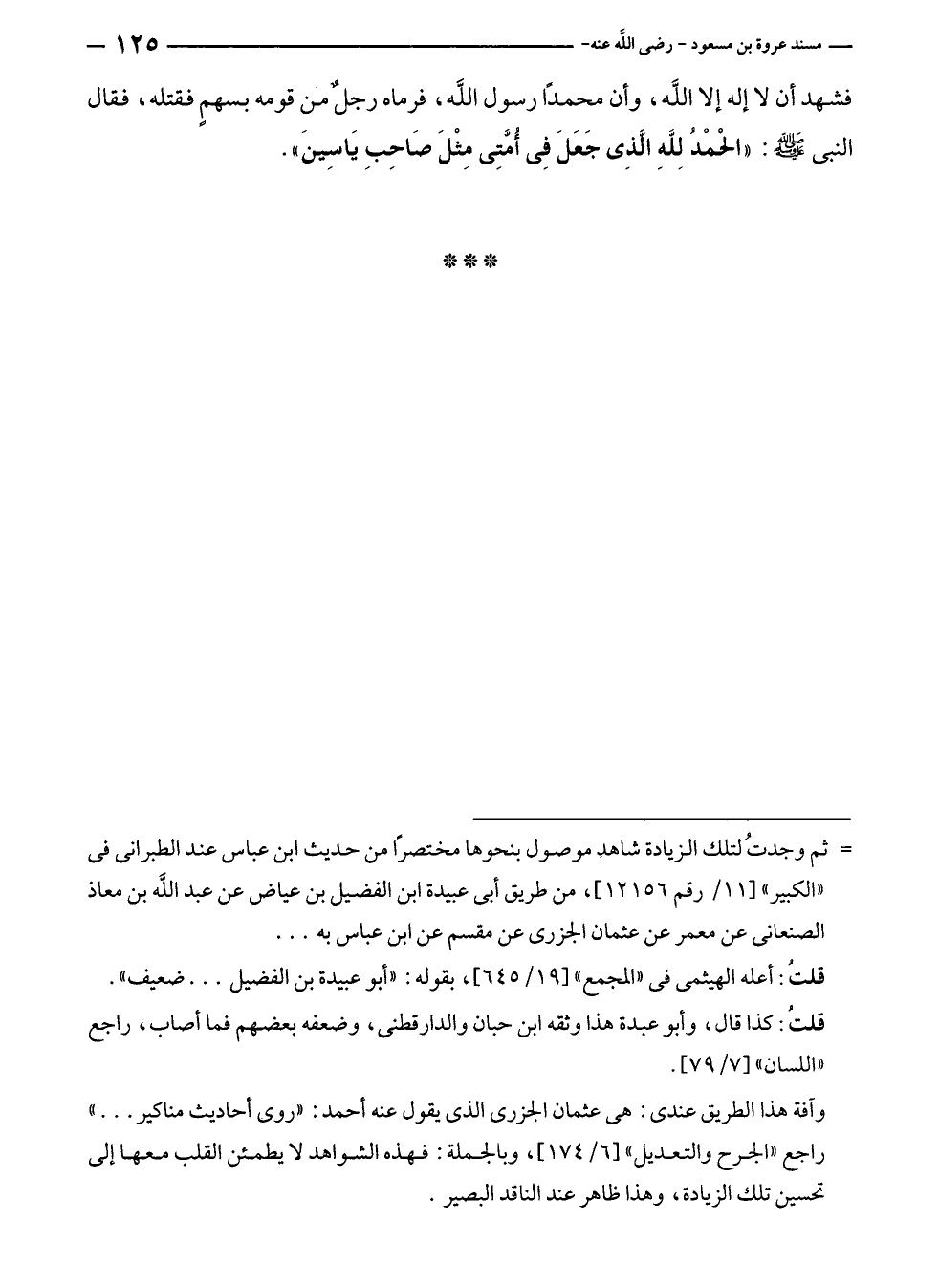 وآفة هذا الطريق عندى: هي عثمان الجزرى الذي يقول عنه أحمد: "روى أحاديث مناكير ... " راجع "الجرح والتعديل" [٦/ ١٧٤]، وبالجملة: فهذه الشواهد لا يطمئن القلب معها إلى تحسين تلك الزيادة، وهذا ظاهر عند الناقد البصير.