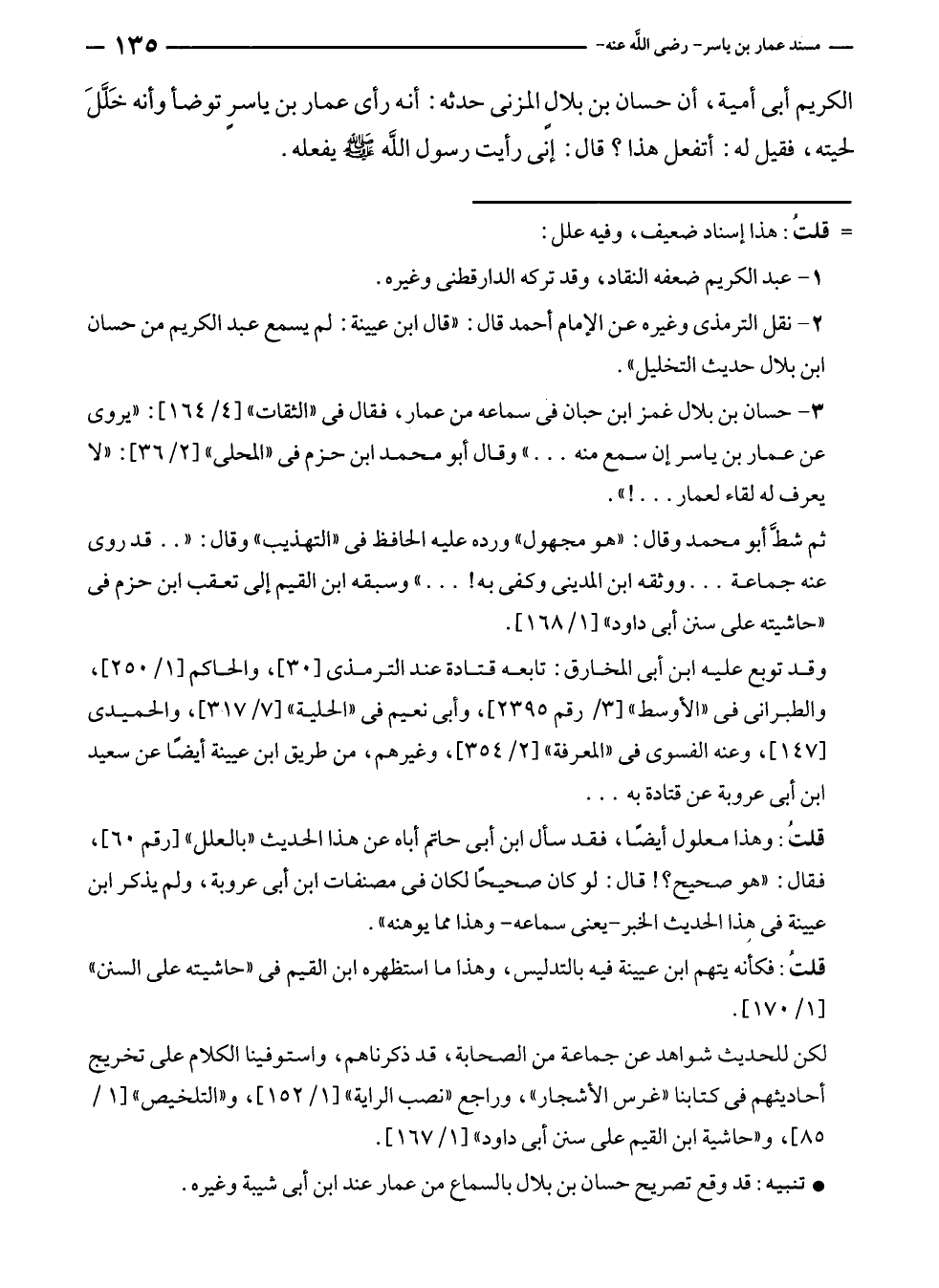 الكريم أبى أمية، أن حسان بن بلالٍ المزنى حدثه: أنه رأى عمار بن ياسرٍ توضأ وأنه خَلَّلَ لحيته، فقيل له: أتفعل هذا؟ قال: إنى رأيت رسول الله - صلى الله عليه وسلم - يفعله.