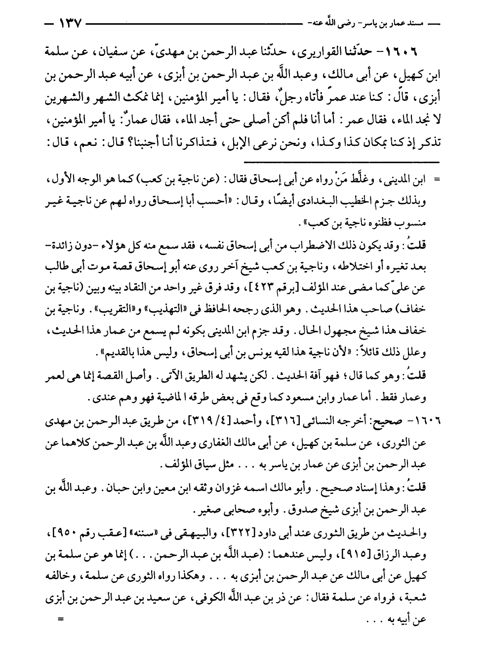 ١٦٠٦ - حدّثنا القواريرى، حدّثنا عبد الرحمن بن مهديّ، عن سفيان، عن سلمة بن كهيلٍ، عن أبى مالكٍ، وعبد الله بن عبد الرحمن بن أبزى، عن أبيه عبد الرحمن بن أبزى، قال: كنا عند عمر فأتاه رجلٌ، فقال: يا أمير المؤمنين، إنما نمكث الشهر والشهرين لا نجد الماء، فقال عمر: أما أنا فلم أكن أصلى حتى أجد الماء، فقال عمارٌ: يا أمير المؤمنين، تذكر إذ كنا بمكان كذا وكذا، ونحن نرعى الإبل، فتذاكرنا أنا أجنبنا؟ قال: نعم، قال: