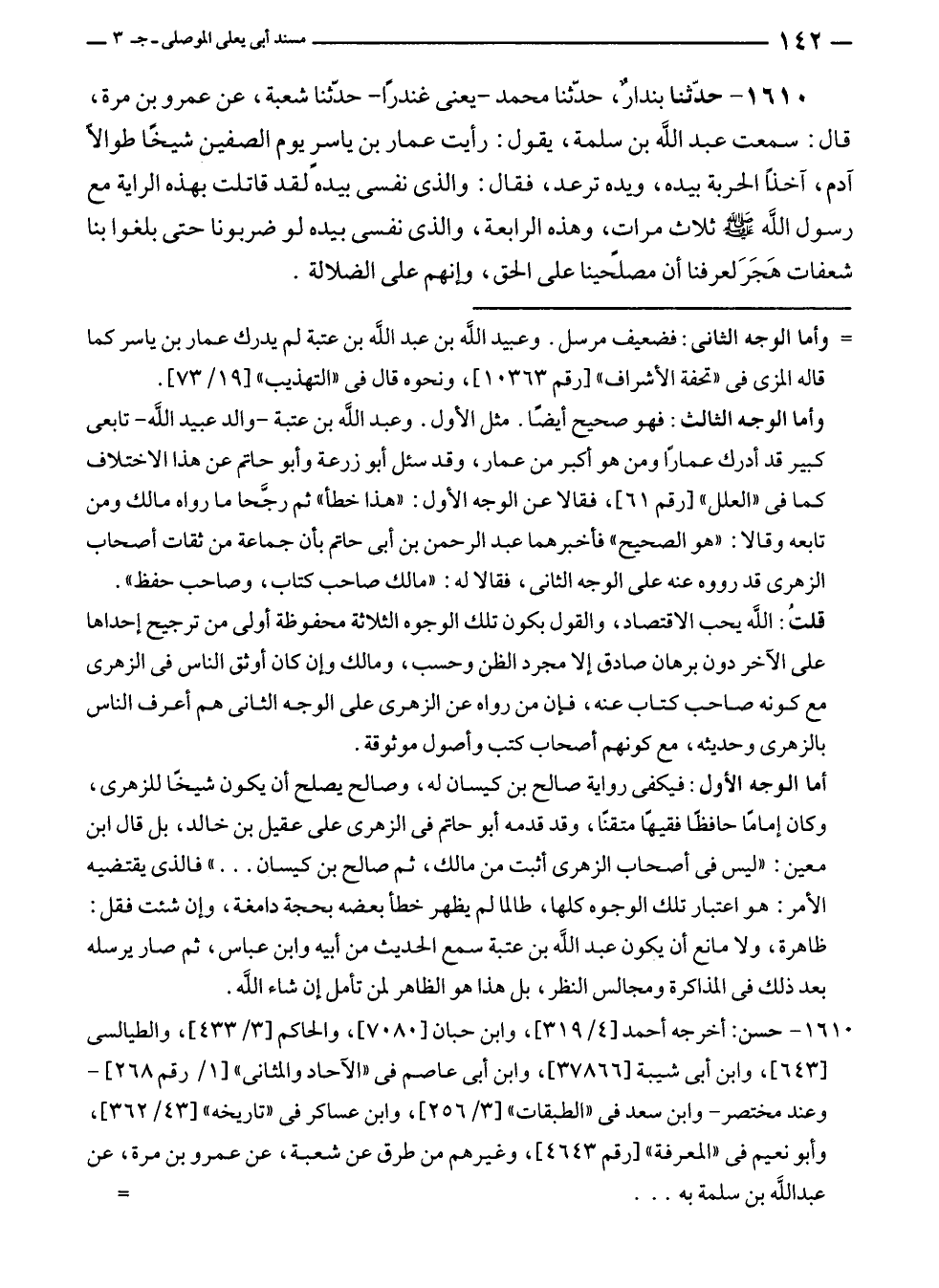 وأما الوجه الثالث: فهو صحيح أيضًا. مثل الأول. وعبد الله بن عتبة - والد عبيد الله - تابعى كبير قد أدرك عمارًا ومن هو أكبر من عمار، وقد سئل أبو زرعة وأبو حاتم عن هذا الاختلاف كما في "العلل" [رقم ٦١]، فقالا عن الوجه الأول: "هذا خطأ" ثم رجَّحا ما رواه مالك ومن تابعه وقالا: "هو الصحيح" فأخبرهما عبد الرحمن بن أبى حاتم بأن جماعة من ثقات أصحاب الزهرى قد رووه عنه على الوجه الثاني، فقالا له: "مالك صاحب كتاب، وصاحب حفظ".