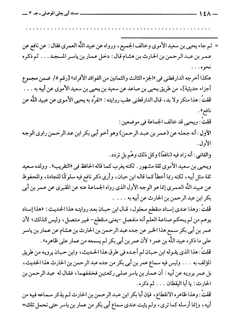 = ثم جاء يحيى بن سعيد الأموى وخالف الجميع، ورواه عن عبيد الله العمرى فقال: عن نافع عن عمر بن عبد الرحمن بن الحارث بن هشام قال: دخل عمار بن ياسر المسجد ... ثم ذكره نحوه ...