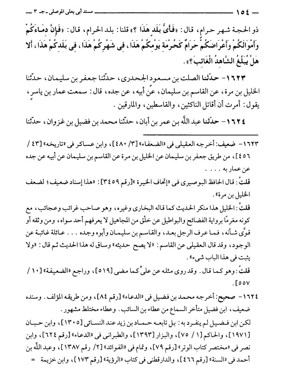 ١٦٢٣ - حدّثنا الصلت بن مسعودٍ الجحدرى، حدّثنا جعفر بن سليمان، حدّثنا الخليل بن مرة، عن القاسم بن سليمان، عن أبيه، عن جده، قال: سمعت عمار بن ياسرٍ، يقول: أمرت أن أقاتل الناكثين، والقاسطين، والمارقين.
