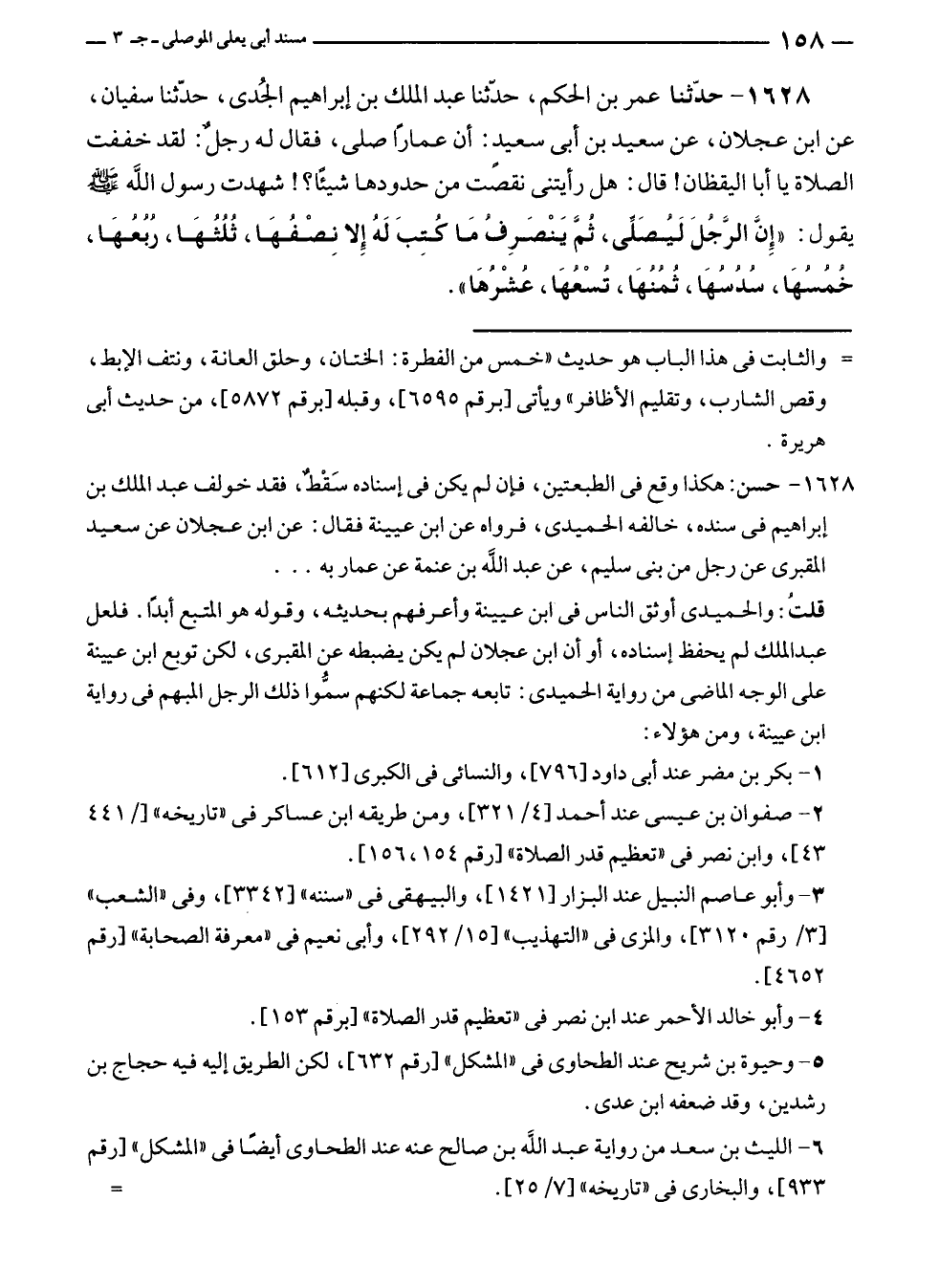 ١٦٢٨ - حسن: هكذا وقع في الطبعتين، فإن لم يكن في إسناده سَقْطٌ، فقد خولف عبد الملك بن إبراهيم في سنده، خالفه الحميدى، فرواه عن ابن عيينة فقال: عن ابن عجلان عن سعيد المقبرى عن رجل من بنى سليم، عن عبد الله بن عنمة عن عمار به.