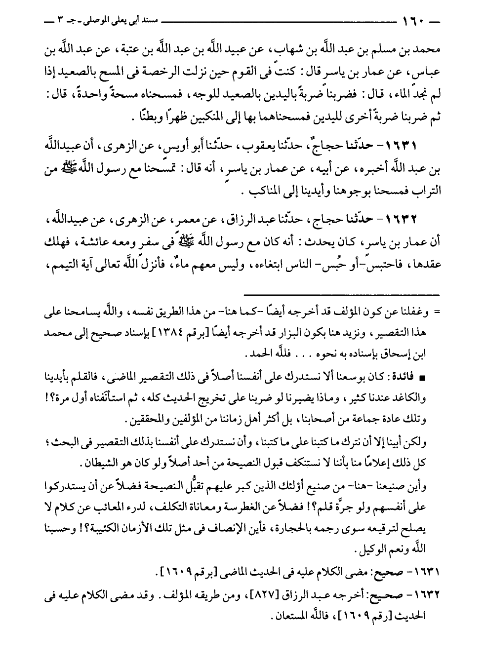 ١٦٣١ - حدّثنا حجاجٌ، حدّثنا يعقوب، حدّثنا أبو أويسٍ، عن الزهرى، أن عبيد الله بن عبد الله أخبره، عن أبيه، عن عمار بن ياسرٍ، أنه قال: تمسحنا مع رسول الله - صلى الله عليه وسلم - من التراب فمسحنا بوجوهنا وأيدينا إلى المناكب.