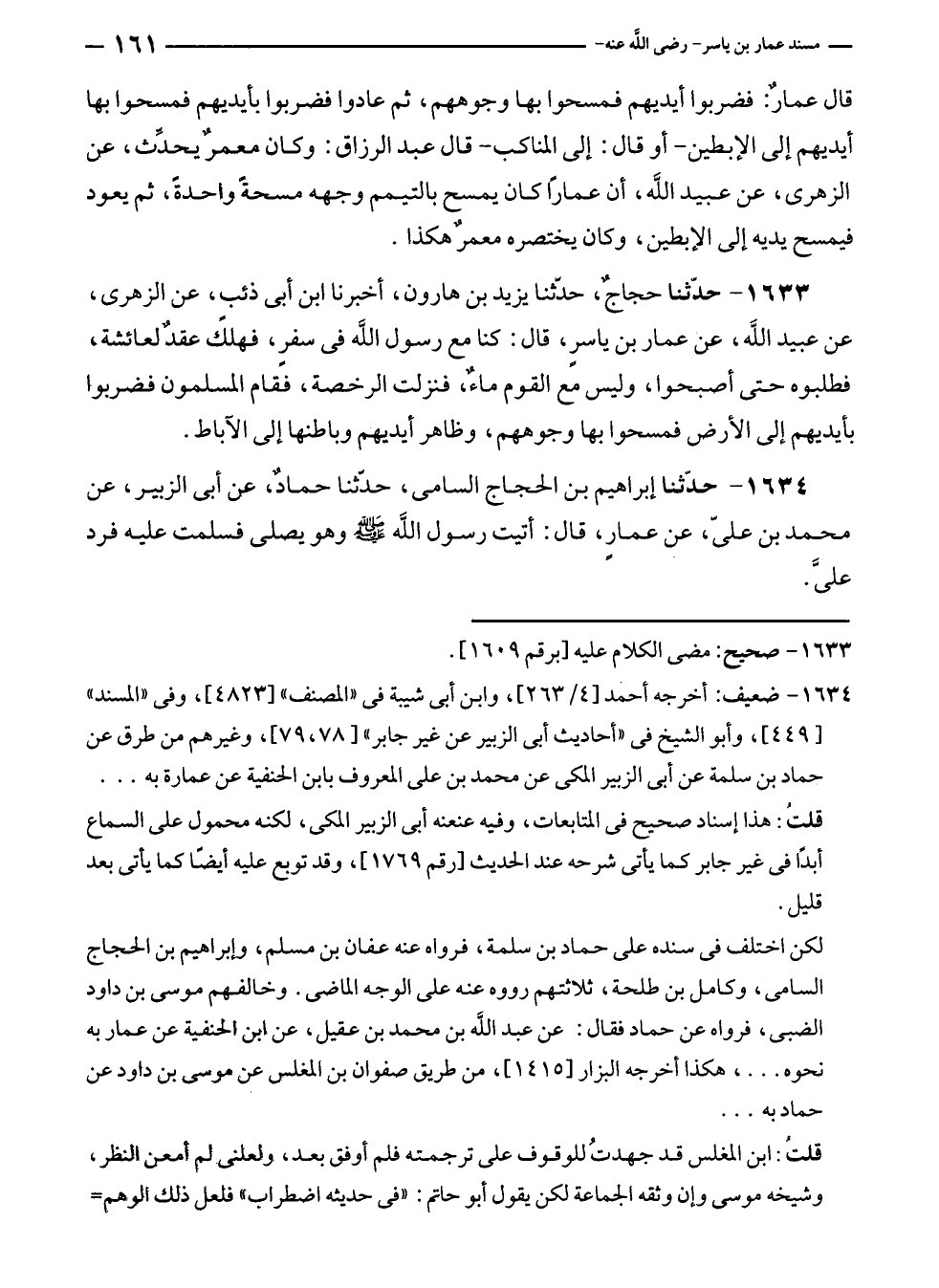 ١٦٣٤ - حدّثنا إبراهيم بن الحجاج السامى، حدّثنا حمادٌ، عن أبى الزبير، عن محمد بن عليّ، عن عمار، قال: أتيت رسول الله - صلى الله عليه وسلم - وهو يصلى فسلمت عليه فرد عليَّ.