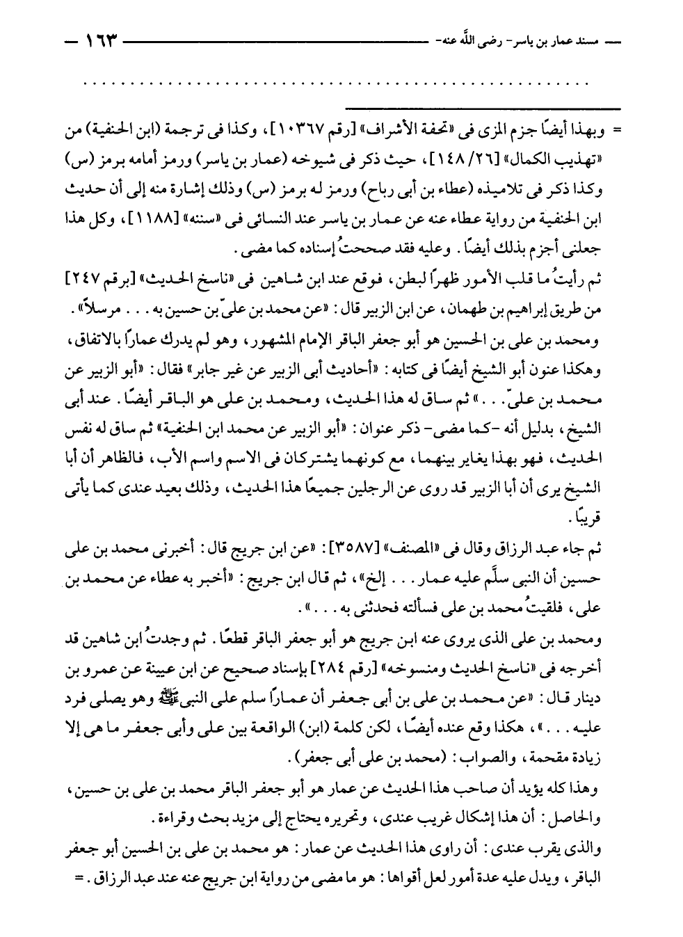 وهذا كله يؤيد أن صاحب هذا الحديث عن عمار هو أبو جعفر الباقر محمد بن على بن حسين، والحاصل: أن هذا إشكال غريب عندى، وتحريره يحتاج إلى مزيد بحث وقراءة.