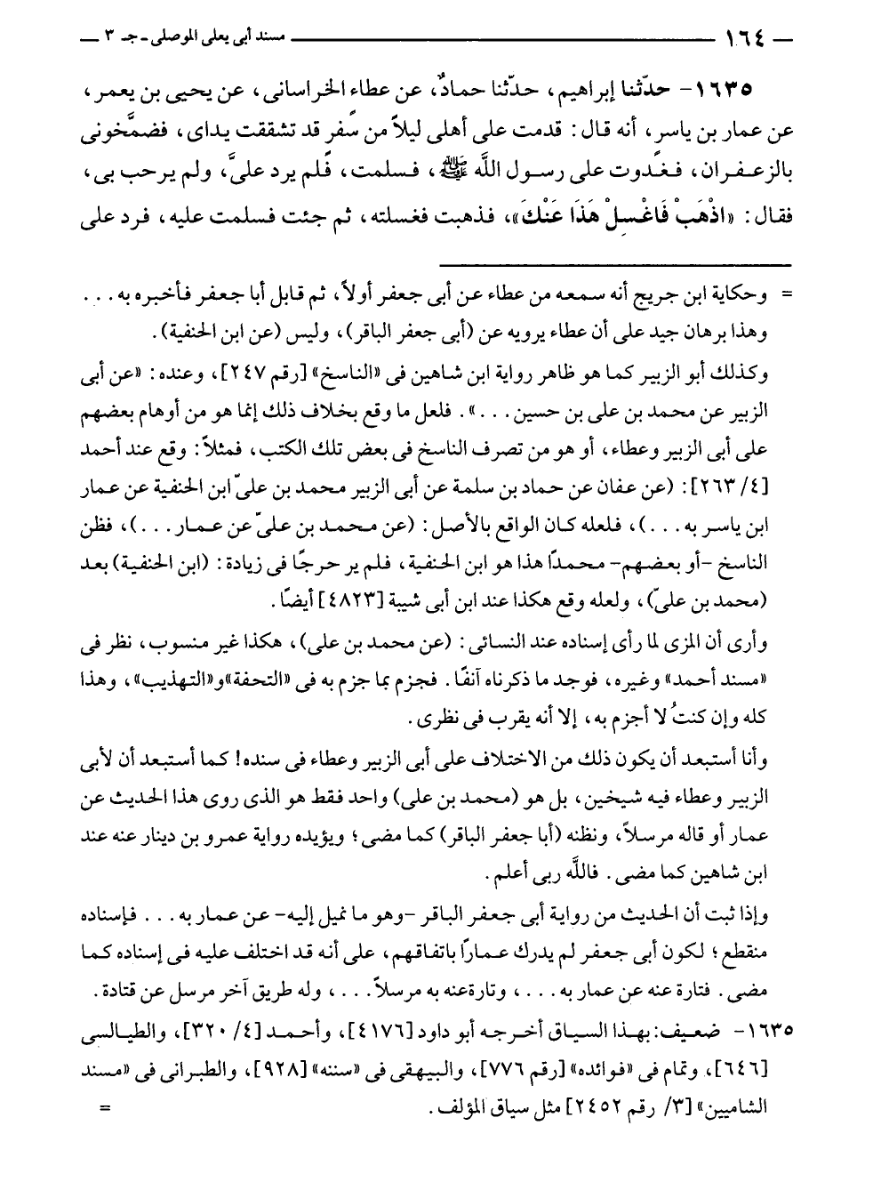 ١٦٣٥ - حدّثنا إبراهيم، حدّثنا حمادٌ، عن عطاءٍ الخراسانى، عن يحيى بن يعمر، عن عمار بن ياسرٍ، أنه قال: قدمت على أهلى ليلًا من سفرٍ قد تشققت يداى، فضمَّخونى بالزعفران، فغدوت على رسول الله - صلى الله عليه وسلم -، فسلمت، فلم يرد عليَّ، ولم يرحب بى، فقال: "اذْهَبْ فَاغْسِلْ هَذَا عَنْكَ"، فذهبت فغسلته، ثم جئت فسلمت عليه، فرد على