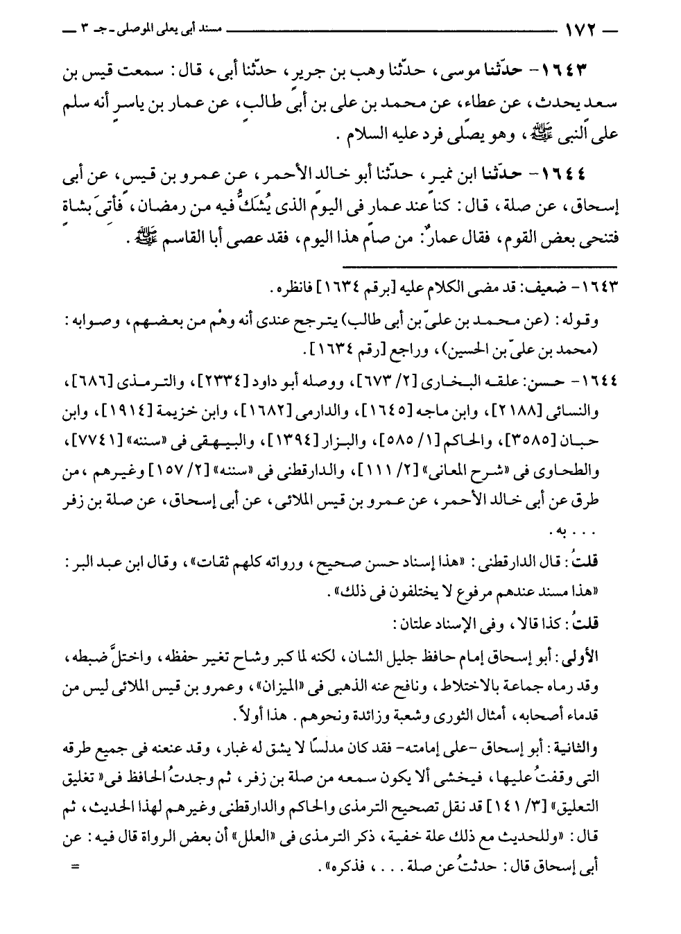 ١٦٤٤ - حدّثنا ابن نمير، حدّثنا أبو خالدٍ الأحمر، عن عمرو بن قيسٍ، عن أبى إسحاق، عن صلة، قال: كنا عند عمارٍ في اليوم الذي يُشَكُّ فيه من رمضان، فأتِىَ بشاةٍ فتنحى بعض القوم، فقال عمارٌ: من صام هذا اليوم، فقد عصى أبا القاسم - صلى الله عليه وسلم -.