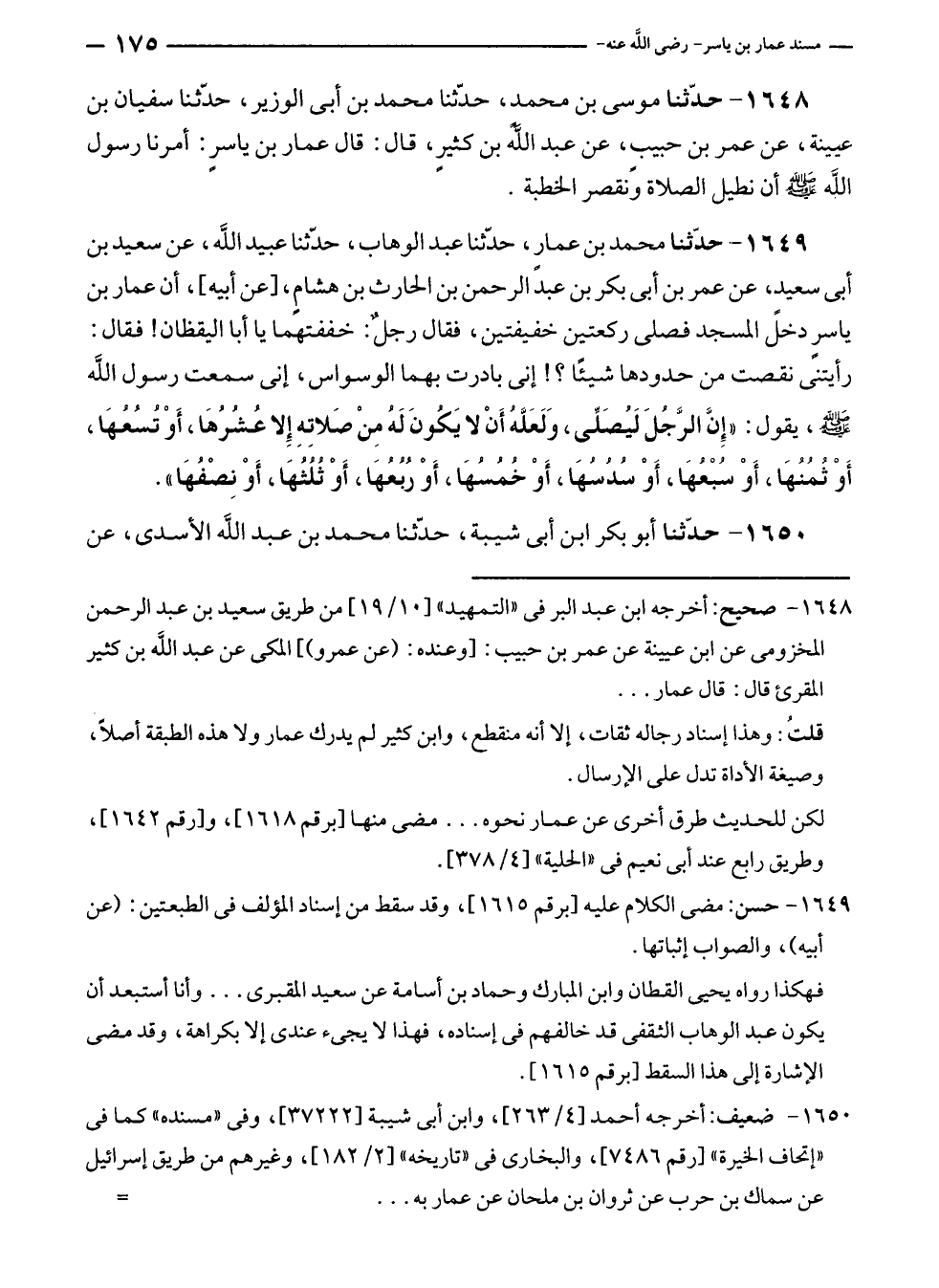 ١٦٤٩ - حدّثنا محمد بن عمارٍ، حدّثنا عبد الوهاب، حدّثنا عبيد الله، عن سعيد بن أبى سعيدٍ، عن عمر بن أبى بكر بن عبد الرحمن بن الحارث بن هشامٍ، [عن أبيه]، أن عمار بن ياسرٍ دخل المسجد فصلى ركعتين خفيفتين، فقال رجلٌ: خففتهما يا أبا اليقظان! فقال: رأيتنى نقصت من حدودها شيئًا؟! إنى بادرت بهما الوسواس، إنى سمعت رسول الله - صلى الله عليه وسلم -، يقول: "إِنَّ الرَّجُلَ لَيُصَلِّي، وَلَعَلَّهُ أَنْ لا يَكُونَ لَهُ مِنْ صَلاتِهِ إلا عُشُرُهَا، أَوْ تُسُعُهَا، أَوْ ثُمُنُهَا، أَوْ سُبْعُهَا، أَوْ سُدُسُهَا، أَوْ خُمُسُهَا، أَوْ رُبُعُهَا، أَوْ ثُلُثُهَا، أَوْ نِصْفُهَا".