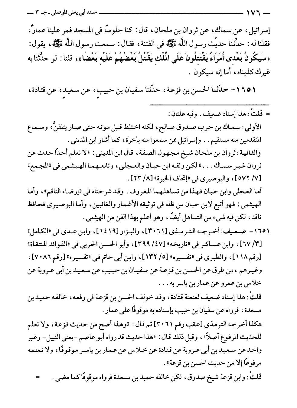 إسرائيل، عن سماكٍ، عن ثروان بن ملحان، قال: كنا جلوسًا في المسجد فمر علينا عمارٌ، فقلنا له: حدِّثنا حديث رسول الله - صلى الله عليه وسلم - في الفتنة، فقال: سمعت رسول الله - صلى الله عليه وسلم -، يقول: "سَيَكونُ بَعْدِى أمَرَاءُ يَقْتَتِلُونَ عَلَى الْملْكِ يَقْتُلُ بَعْضُهُمْ عَلَيْهِ بَعْضًا"، قلنا: لو حدَّثنا به غيرك كذبناه، أما إنه سيكون.