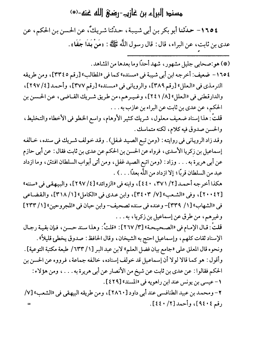 ١٦٥٤ - ضعيف: أخرجه ابن أبى شيبة في "مسنده" كما في "المطالب" [رقم ٣٣٤٥]، ومن طريقه الترمذى في "العلل" [رقم ٣٨٩]، والرويانى في "مسنده" [رقم ٣٧٧]، وأحمد [٤/ ٢٩٧]، والدارقطنى في "العلل" [٨/ ٢٤١]، وغيرهم، من طريق شريك القاضى، عن الحسن بن الحكم، عن عدى بن ثابت عن البراء بن عازب به ...