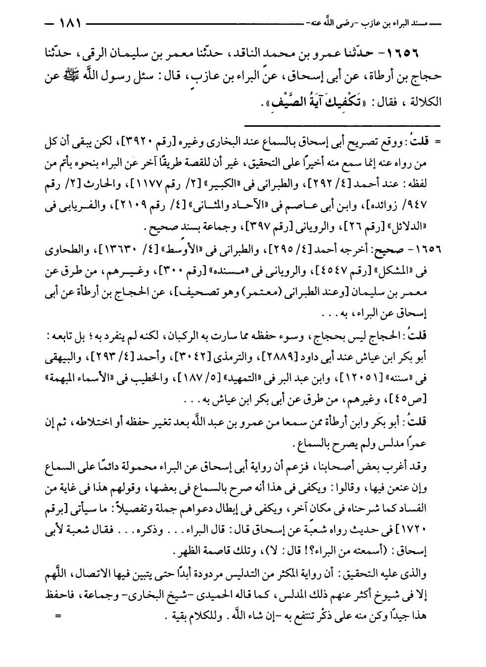 وقد أغرب بعض أصحابنا، فزعم أن روابة أبى إسحاق عن البراء محمولة دائمًا على السماع وإن عنعن فيها، وقالوا: ويكفى في هذا أنه صرح بالسماع في بعضها، وقولهم هذا في غاية من الفساد كما شرحناه في مكانٍ آخر، ويكفى في إبطال دعواهم جملة وتفصيلًا: ما سيأتي [برقم ١٧٢٠] في حديث رواه شعبة عن إسحاق قال: قال البراء ... وذكره ... فقال شعبة لأبى إسحاق: (أسمعته من البراء؟! قال: لا)، وتلك قاصمة الظهر.
