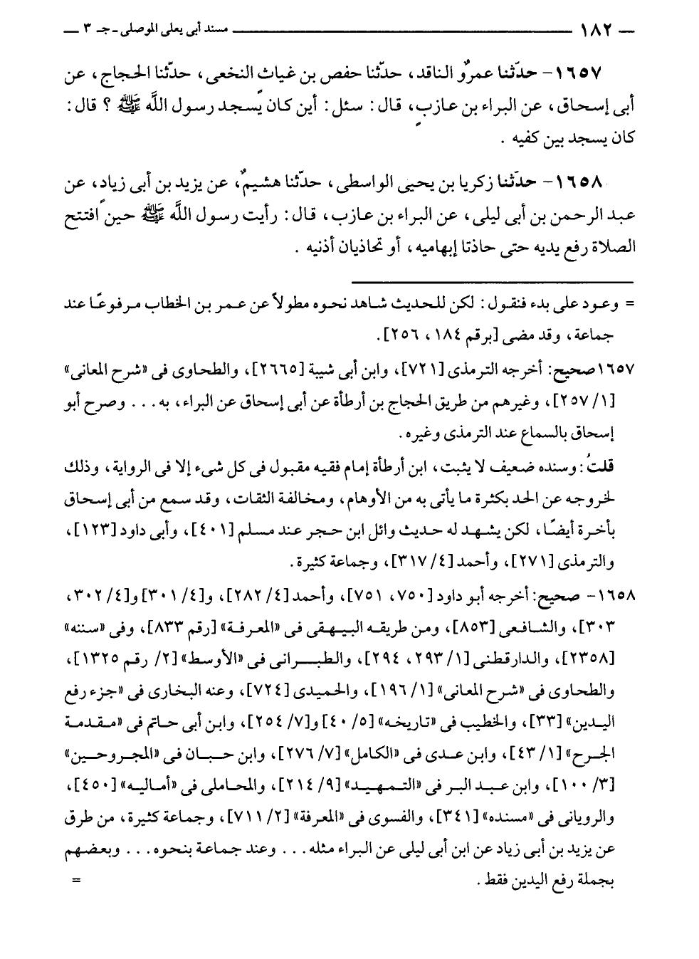 ١٦٥٨ - حدّثنا زكريا بن يحيى الواسطى، حدّثنا هشيمٌ، عن يزيد بن أبى زيادٍ، عن عبد الرحمن بن أبى ليلى، عن البراء بن عازب، قال: رأيت رسول الله - صلى الله عليه وسلم - حين افتتح الصلاة رفع يديه حتى حاذتا إبهاميه، أو تحاذيان أذنيه.