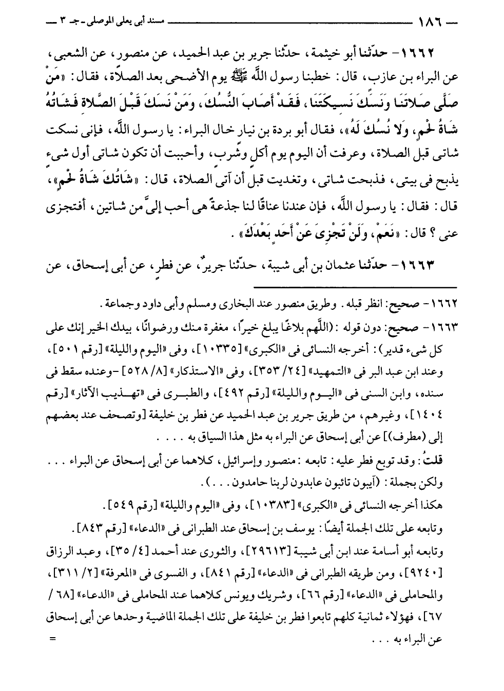 ١٦٦٢ - حدّثنا أبو خيثمة، حدّثنا جرير بن عبد الحميد، عن منصورٍ، عن الشعبى، عن البراء بن عازبٍ، قال: خطبنا رسول الله - صلى الله عليه وسلم - يوم الأضحى بعد الصلاة، فقال: "مَنْ صَلَّى صَلاتَنَا وَنَسَكَ نَسِيكَتَنَا، فَقَدْ أَصَابَ النُّسُكَ، وَمَنْ نَسَكَ قَبْلَ الصَّلاةِ فَشَاتُهُ شاةُ لحْمٍ، وَلا نُسُكَ لَهُ"، فقال أبو بردة بن نيارٍ خال البراء: يا رسول الله، فإنى نسكت شاتى قبل الصلاة، وعرفت أن اليوم يوم أكلٍ وشربٍ، وأحببت أن تكون شاتى أول شئٍ يذبح في بيتى، فذبحت شاتى، وتغديت قبل أن آتى الصلاة، قال: "شَاتُكَ شاةُ لحْمٍ"، قال: فقال: يا رسول الله، فإن عندنا عناقًا لنا جذعةً هي أحب إليَّ من شاتين، أفتجزى عنى؟ قال: "نَعَمْ، وَلَنْ تَجْزِىَ عَنْ أَحَدٍ بَعْدَكَ".