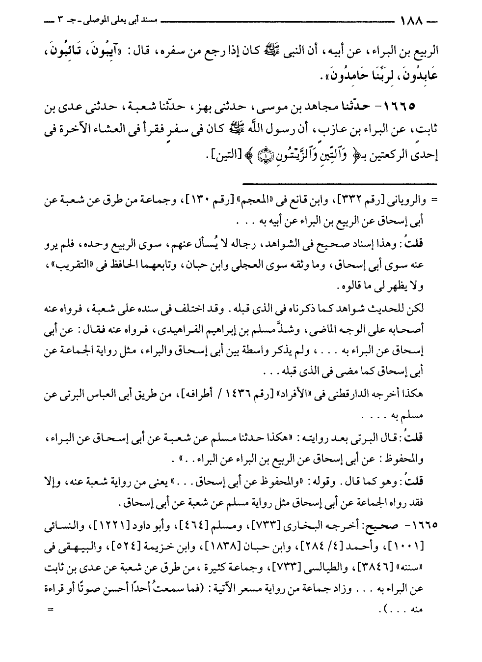 ١٦٦٥ - حدّثنا مجاهد بن موسى، حدثنى بهز، حدّثنا شعبة، حدثنى عدى بن ثابتٍ، عن البراء بن عازب، أن رسول الله - صلى الله عليه وسلم - كان في سفرٍ فقرأ في العشاء الآخرة في إحدى الركعتين بـ {وَالتِّينِ وَالزَّيْتُونِ (١)} [التين].