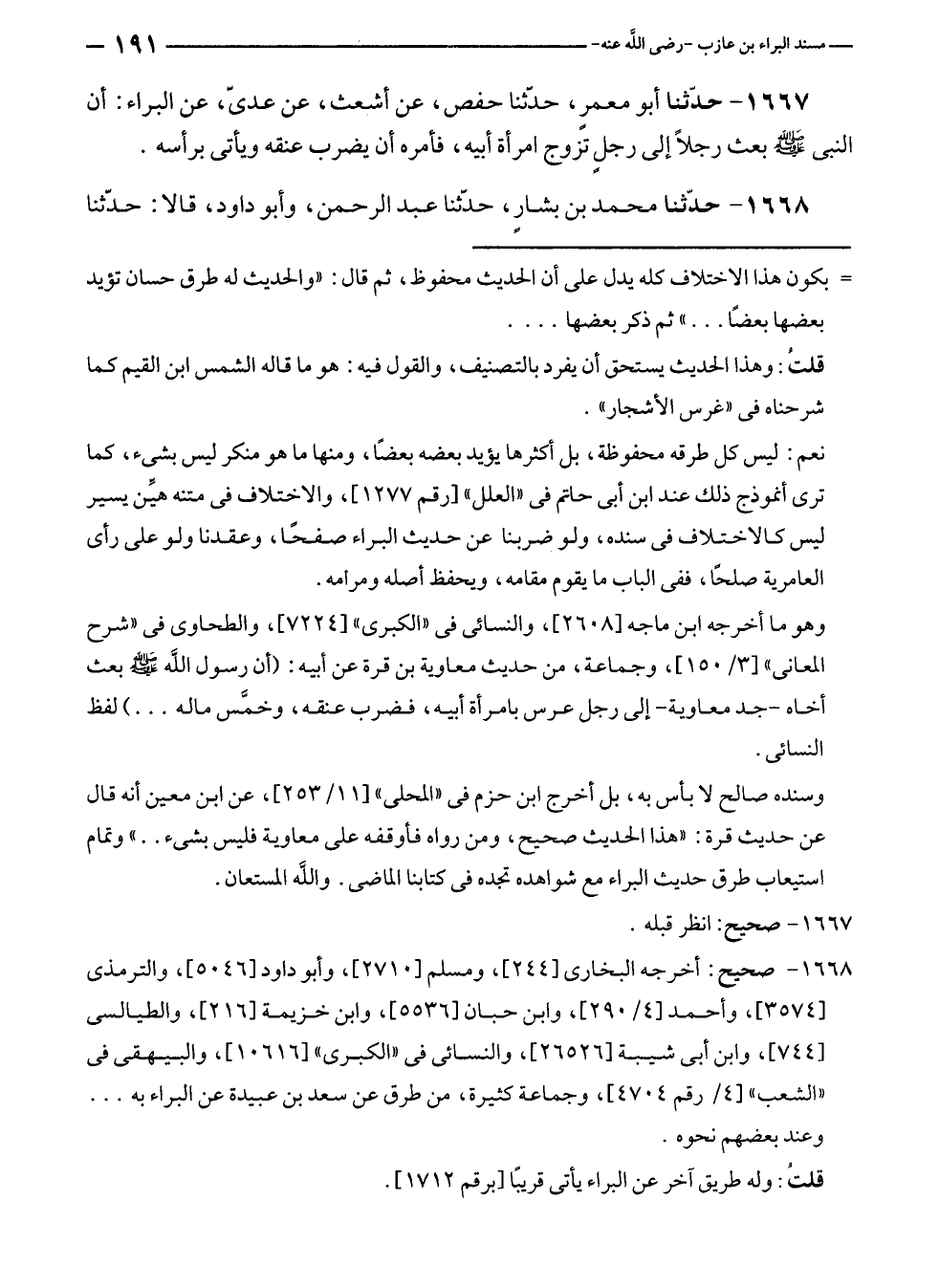 ١٦٦٧ - حدّثنا أبو معمرٍ، حدّثنا حفص، عن أشعث، عن عديّ، عن البراء: أن النبي - صلى الله عليه وسلم - بعث رجلًا إلى رجلٍ تزوج امرأة أبيه، فأمره أن يضرب عنقه ويأتى برأسه.