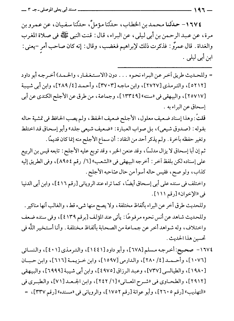 ١٦٧٤ - حدّثنا محمد بن الخطاب، حدّثنا مؤملٌ، حدّثنا سفيان، عن عمرو بن مرة، عن عبد الرحمن بن أبى ليلى، عن البراء، قال: قنت النبي - صلى الله عليه وسلم - في صلاة المغرب والغداة قال عمروٌ: فذكرت ذلك لإبراهيم فغضب، وقال: إنه كان صاحب أمرٍ - يعنى: ابن أبى ليلى.