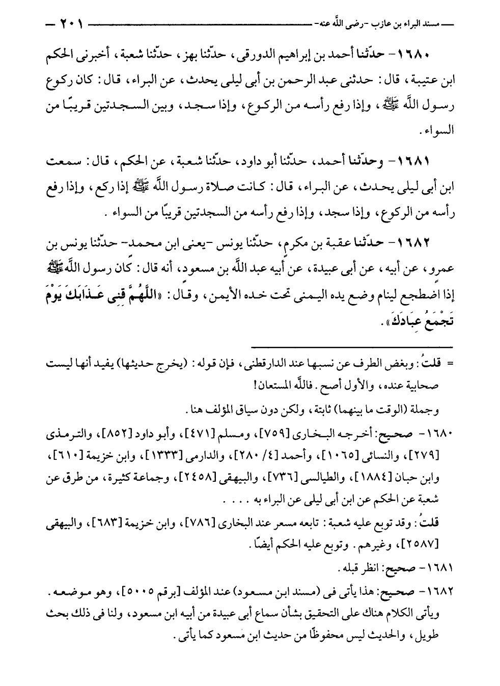 ١٦٨٠ - حدّثنا أحمد بن إبراهيم الدورقى، حدّثنا بهز، حدّثنا شعبة، أخبرنى الحكم بن عتيبة، قال: حدثنى عبد الرحمن بن أبى ليلى يحدث، عن البراء، قال: كان ركوع رسول الله - صلى الله عليه وسلم -، وإذا رفع رأسه من الركوع، وإذا سجد، وبين السجدتين قريبًا من السواء.