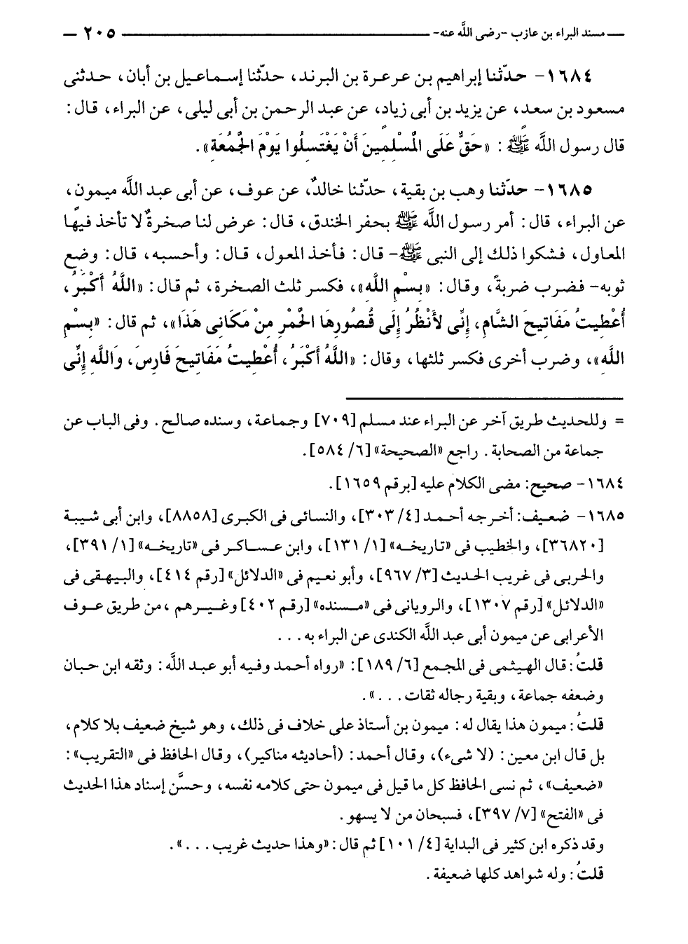 ١٦٨٤ - حدّثنا إبراهيم بن عرعرة بن البرند، حدّثنا إسماعيل بن أبان، حدثنى مسعود بن سعد، عن يزيد بن أبى زيادٍ، عن عبد الرحمن بن أبى ليلى، عن البراء، قال: قال رسول الله - صلى الله عليه وسلم -: "حَقٌّ عَلَى الْمسْلِمينَ أَنْ يَغْتَسِلُوا يَوْمَ الجمُعَةِ".